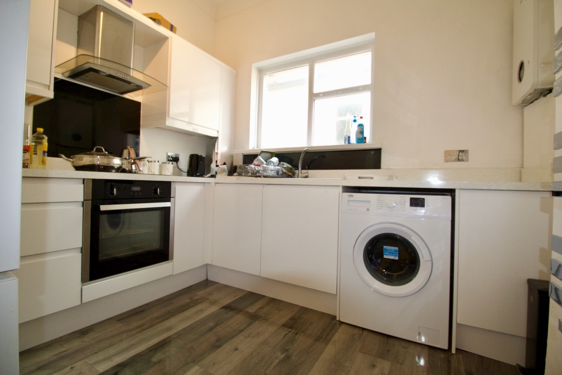 With extensive range of quality modern white base cupboard and drawer units with complimentary work surfaces over providing ample space food preparation, with matching upstand, matching range of high level cupboards, built in one and half bowl sink unit with mixer tap, built-in four ring electric hob unit with extractor hood over, stainless steel built in oven, washing machine, fridge freezer, wood effect vinyl flooring.