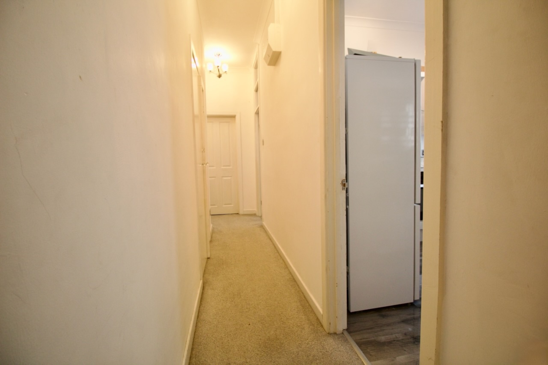 With timber panelled entrance fire door, carpet flooring, small closet to the hall and doors that lead to all the rooms; kitchen, bathroom, large and large living room, radiator, intercom system.