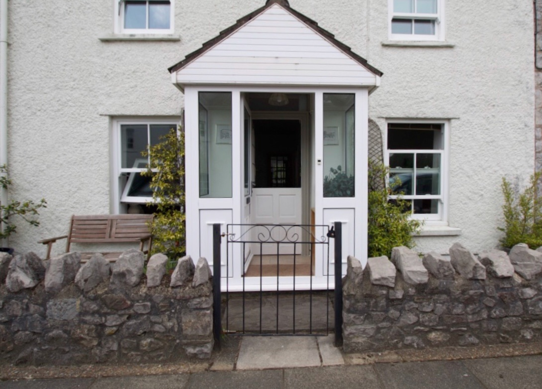 A small boundary wall encloses a paved forecourt large enough for a wooden bench, forming the front garden with wrought iron swing gate providing access. Double-glazed entrance door opens to the porch.