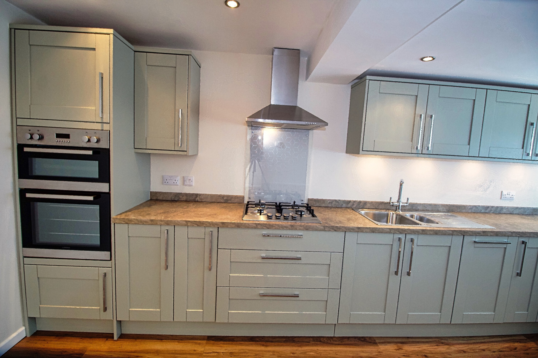 Entered via glazed door from the hall, the kitchen/diner is fitted with quality wall and base units with ample storage, drawers and worktop over, double stainless steel sink, Integrated under counter fridge and freezer, wood flooring is continued from the hall. The kitchen provides the ideal environment for producing those perfect family meals. Four ring gas hob and electric oven, overhead extractor chimney.