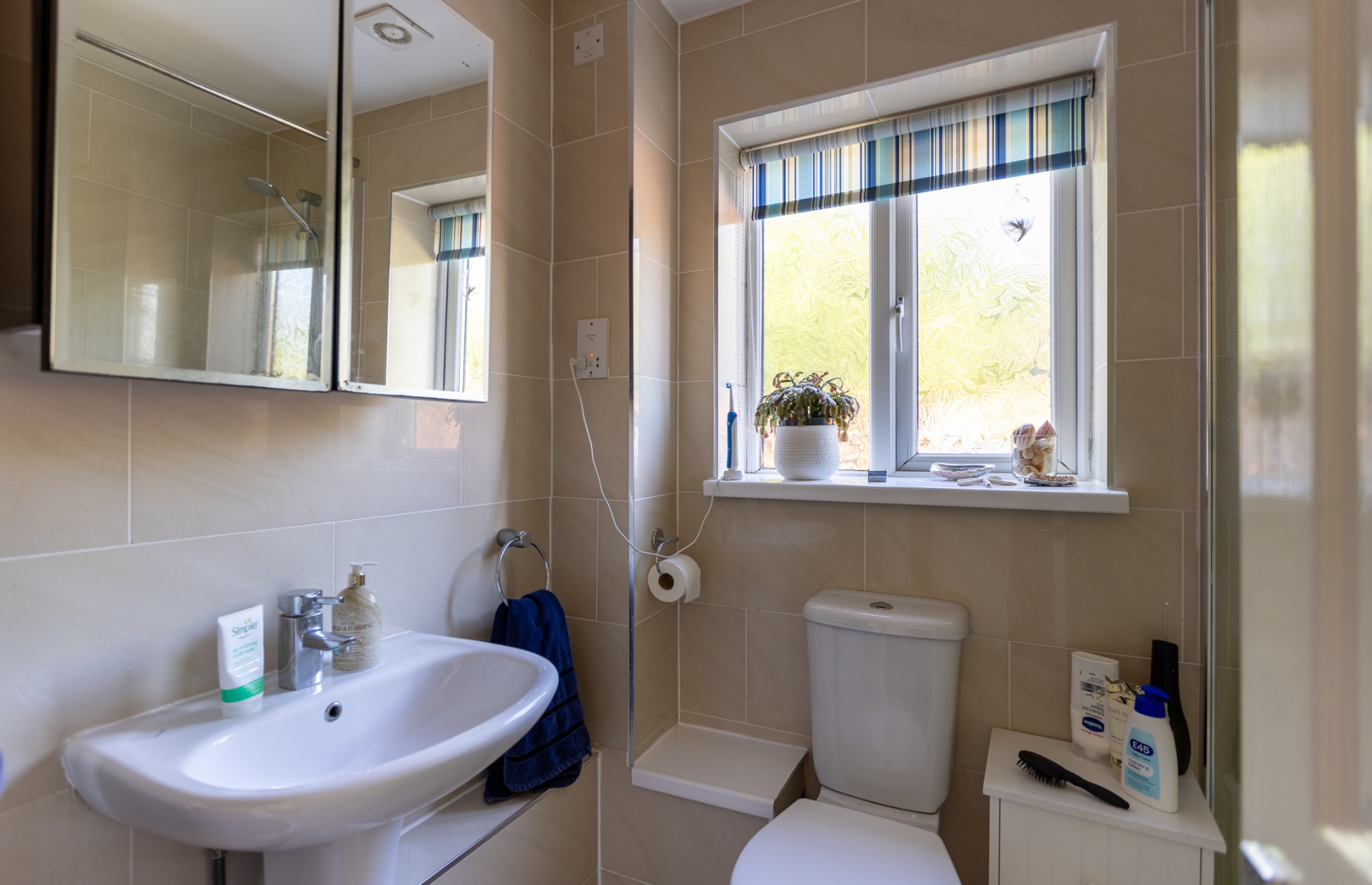 Comprising modern white suite with a walk-in electric shower, low level WC and integrated wash hand basin. Obscure double glazed window to side, modern central heating radiator, tiled throughout and bathroom cabinet.