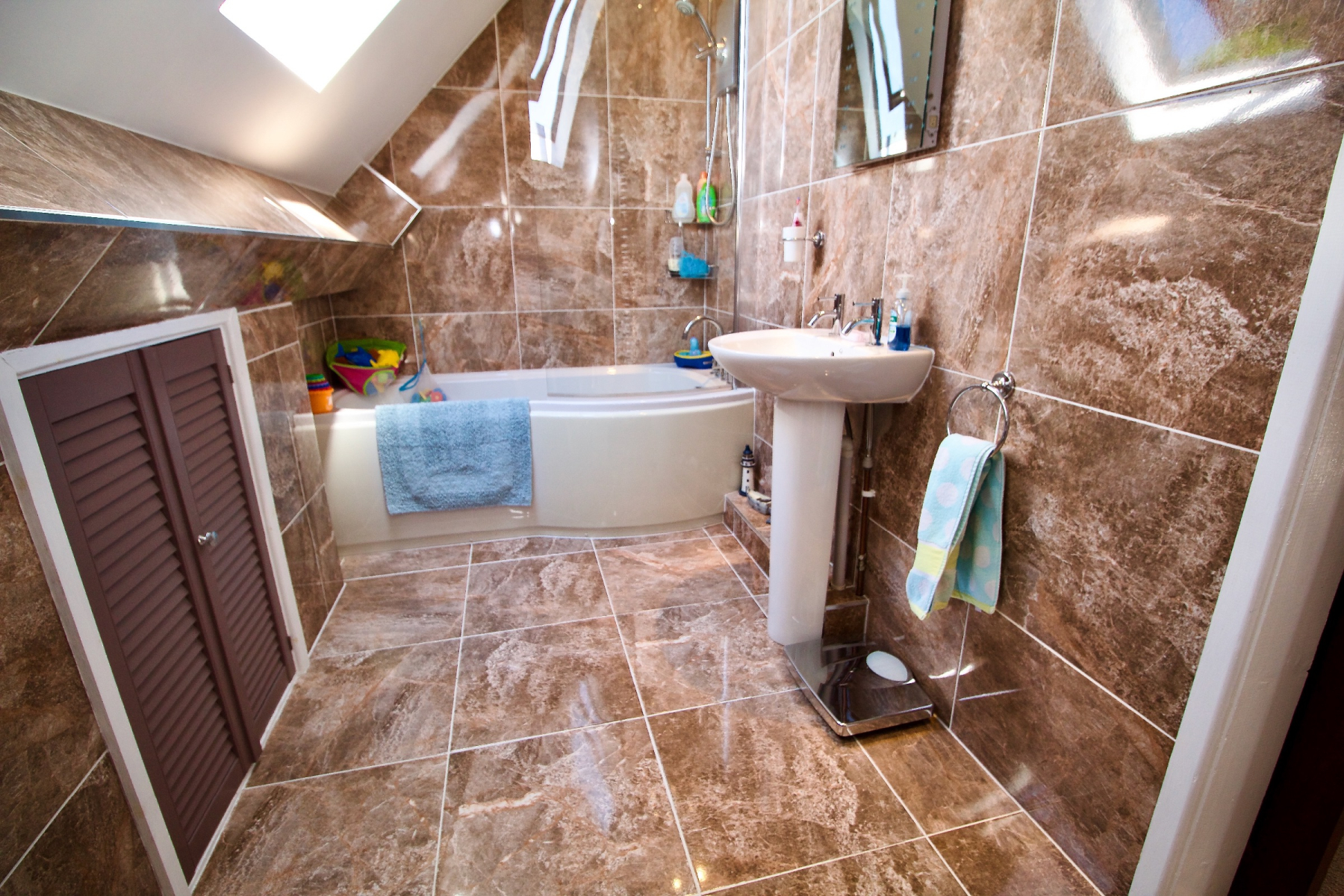 Fully tiled walls with a luxury white suite comprising, pedestal washbasin, WC and large panelled bath with mixer/shower taps over. Obscure glazed roof window to the rear. And storage in the eaves.