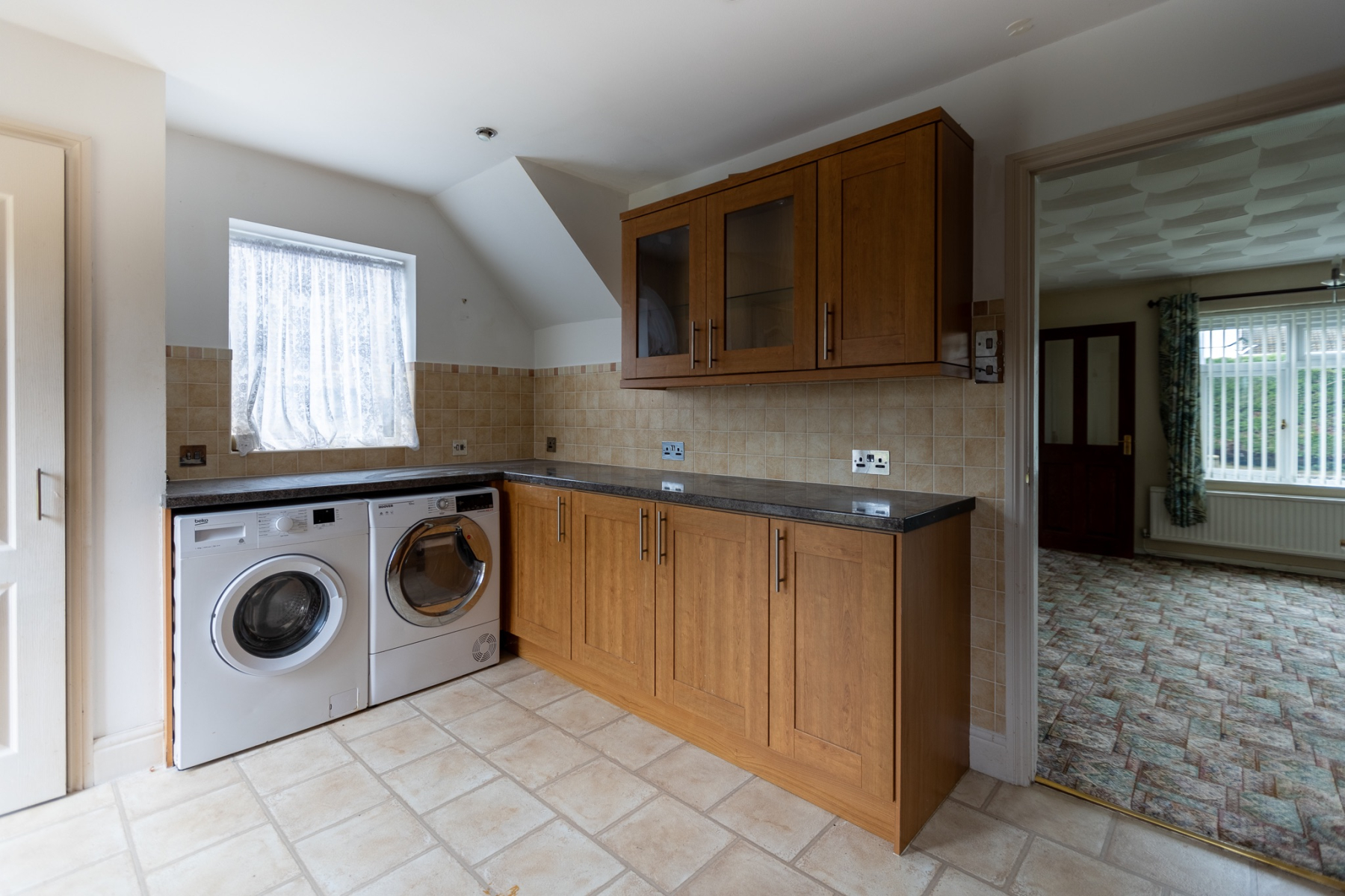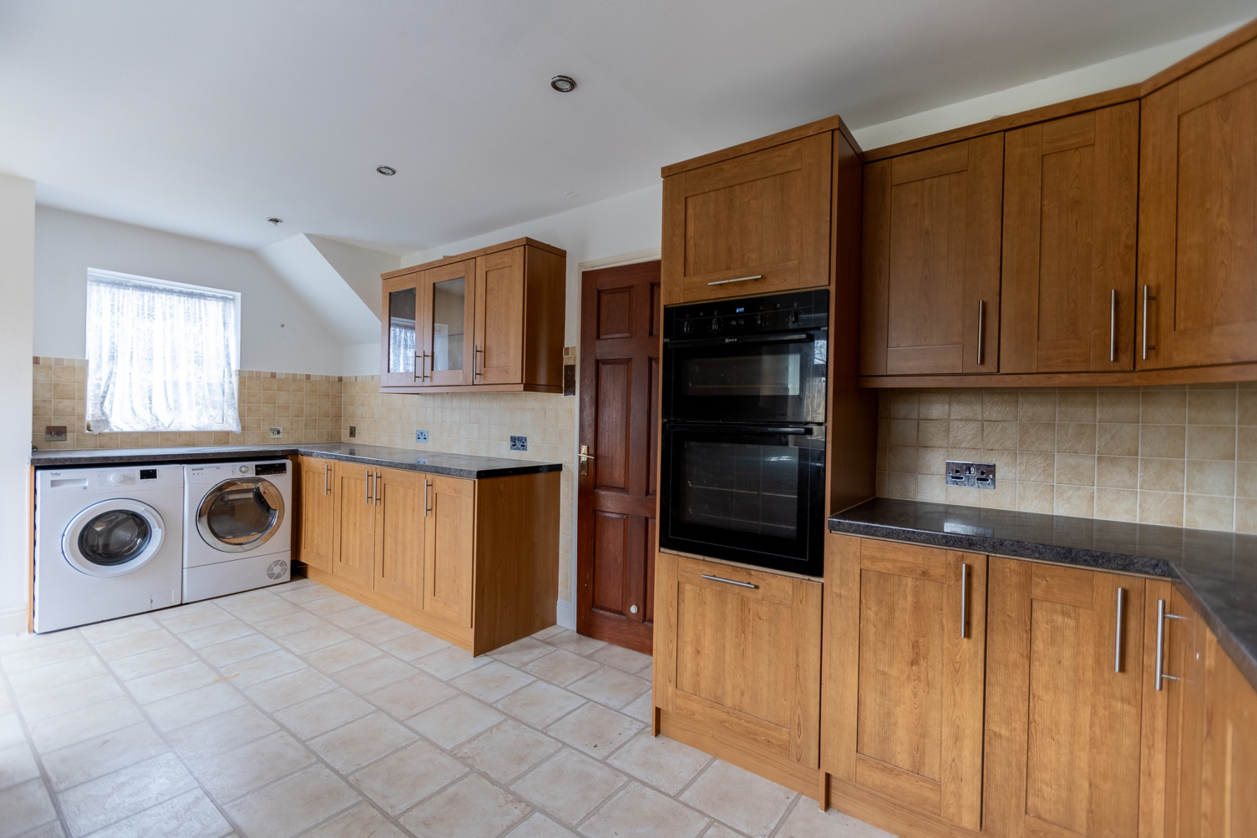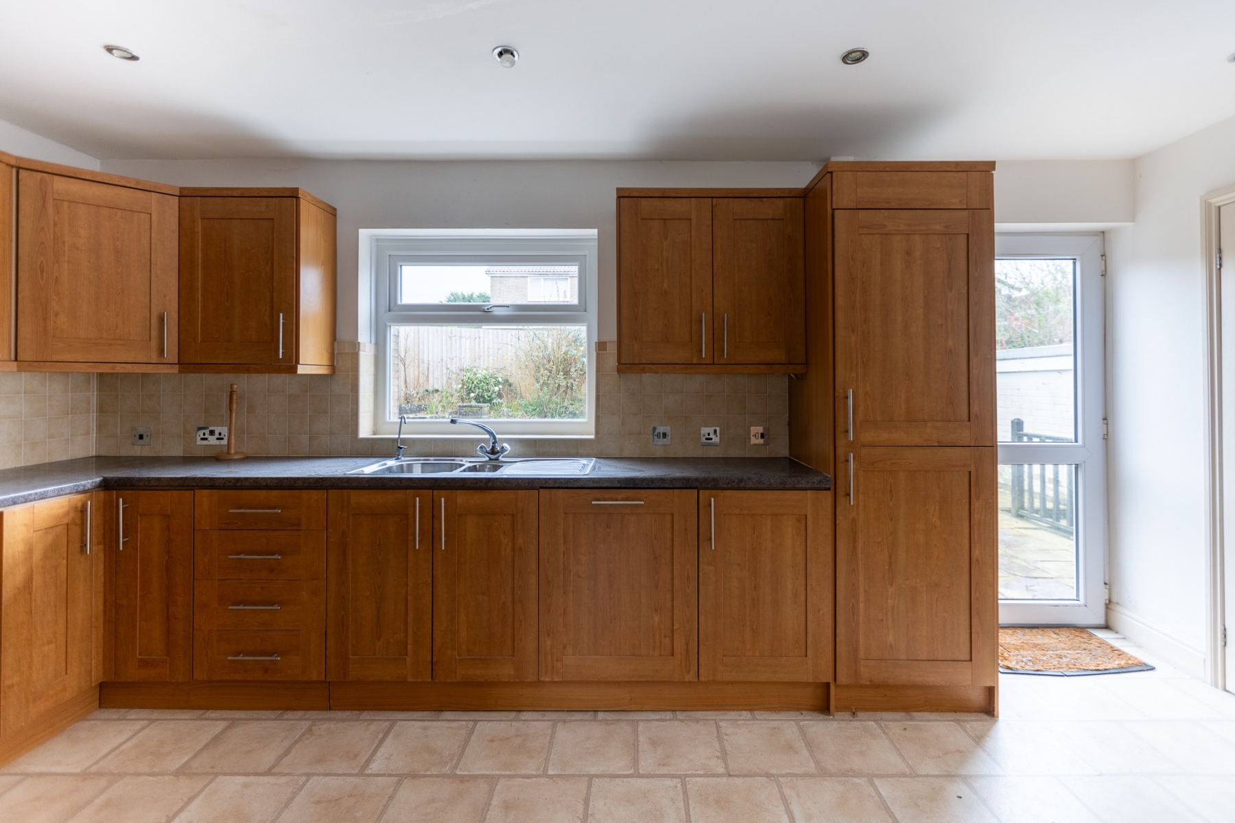A wellproportioned kitchen arranged along four sides and fitted with woodgrain units and laminate worktops. Features include an inset 1.5 bowl stainless steel sink, fourring hob with concealed extractor, integrated oven and grill, dishwasher and fridgefreezer, plus plumbing for a washing machine. Wall cupboards provide excellent storage, and a cupboard houses the Worcester combi boiler. Wellappointed kitchen with integrated appliances. Provides excellent workspace and storage, ideal for busy family routines and home cooking. Windows to the side and rear, tiled splash backs, and door to the garden.
