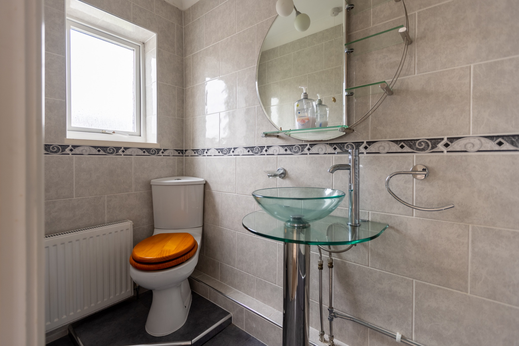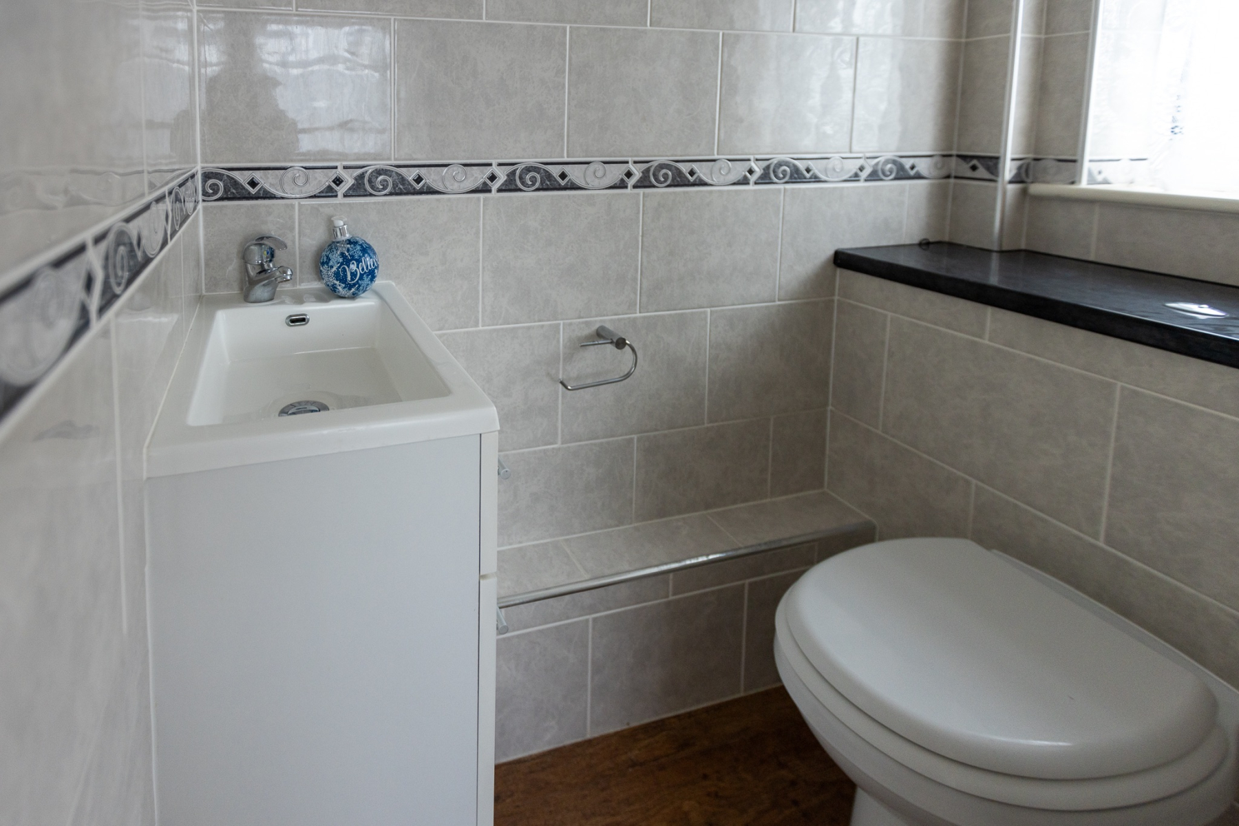 Fitted with a lowlevel WC and vanity wash basin with storage beneath,. Fully tiled walls and an obscured side window provide privacy.