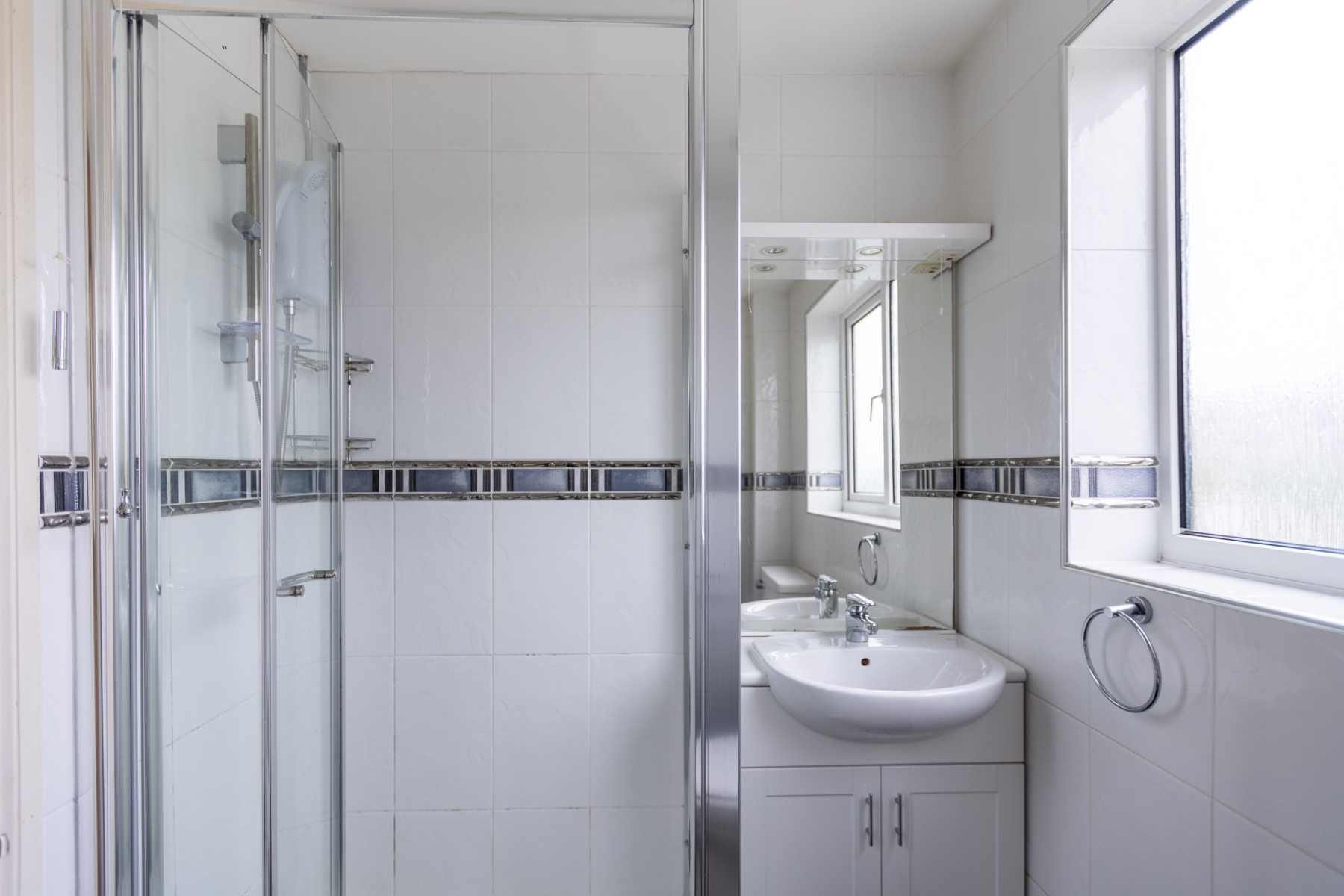 Modern shower room fitted with a white suite including lowlevel WC, vanity wash basin with storage, and a tiled shower enclosure with folding glass screen. Fully tiled walls, obscured rear window, recessed spotlights and chrome heated towel rail. A stylish, lowmaintenance space designed for everyday convenience.