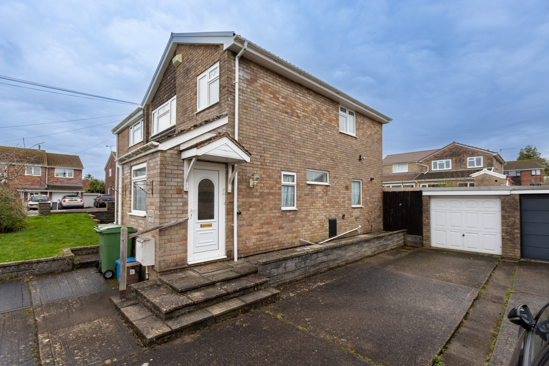 Lawned frontage with established shrubs and lowlevel trees. At least three cars can sit on the driveway which leads to the garage. Paved path to rear garden and outside tap.