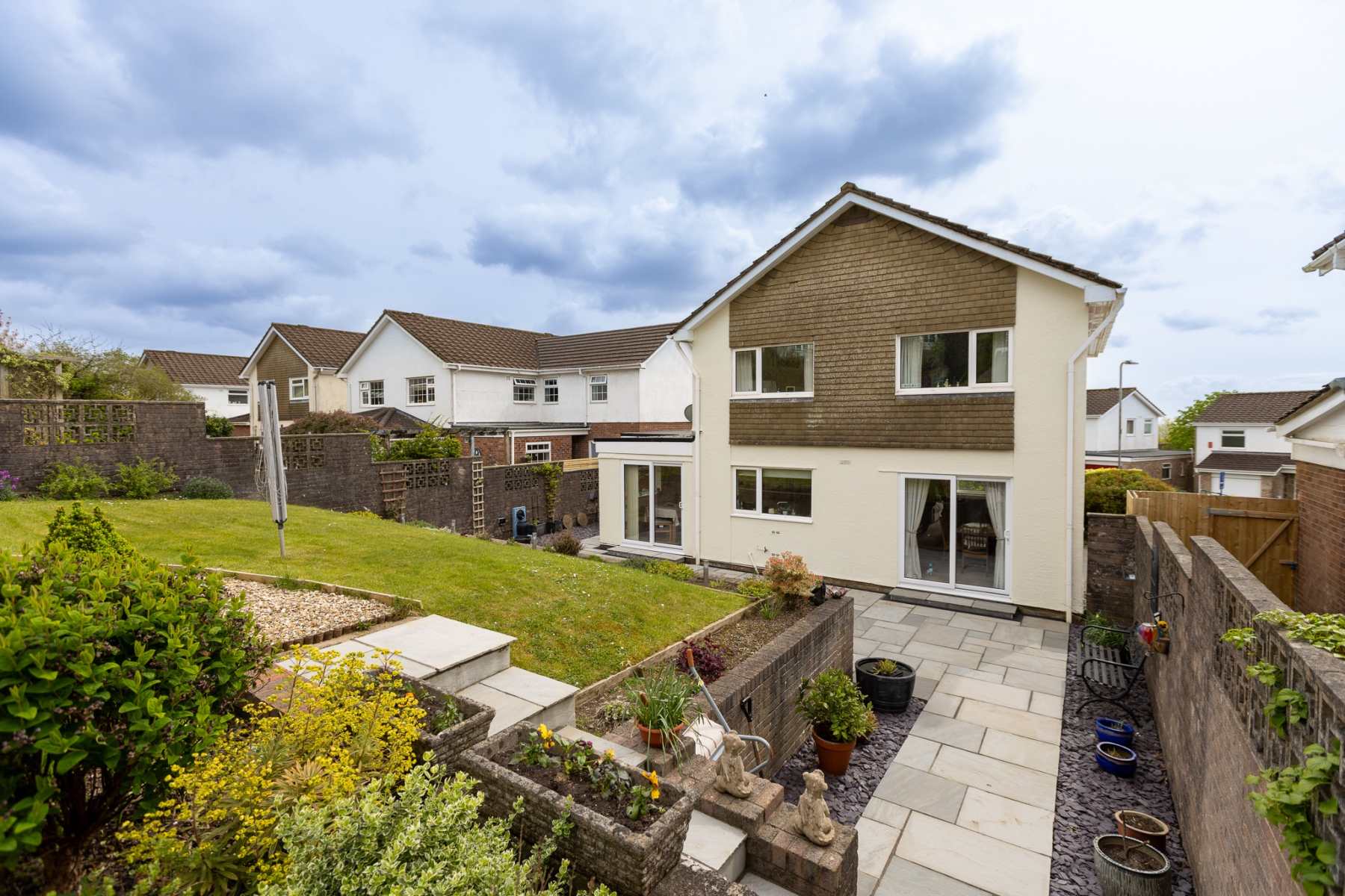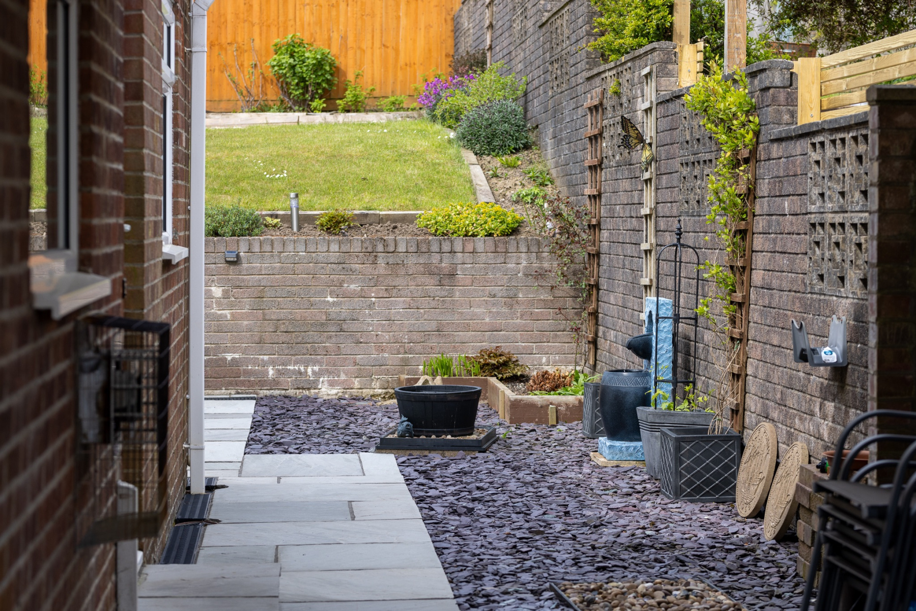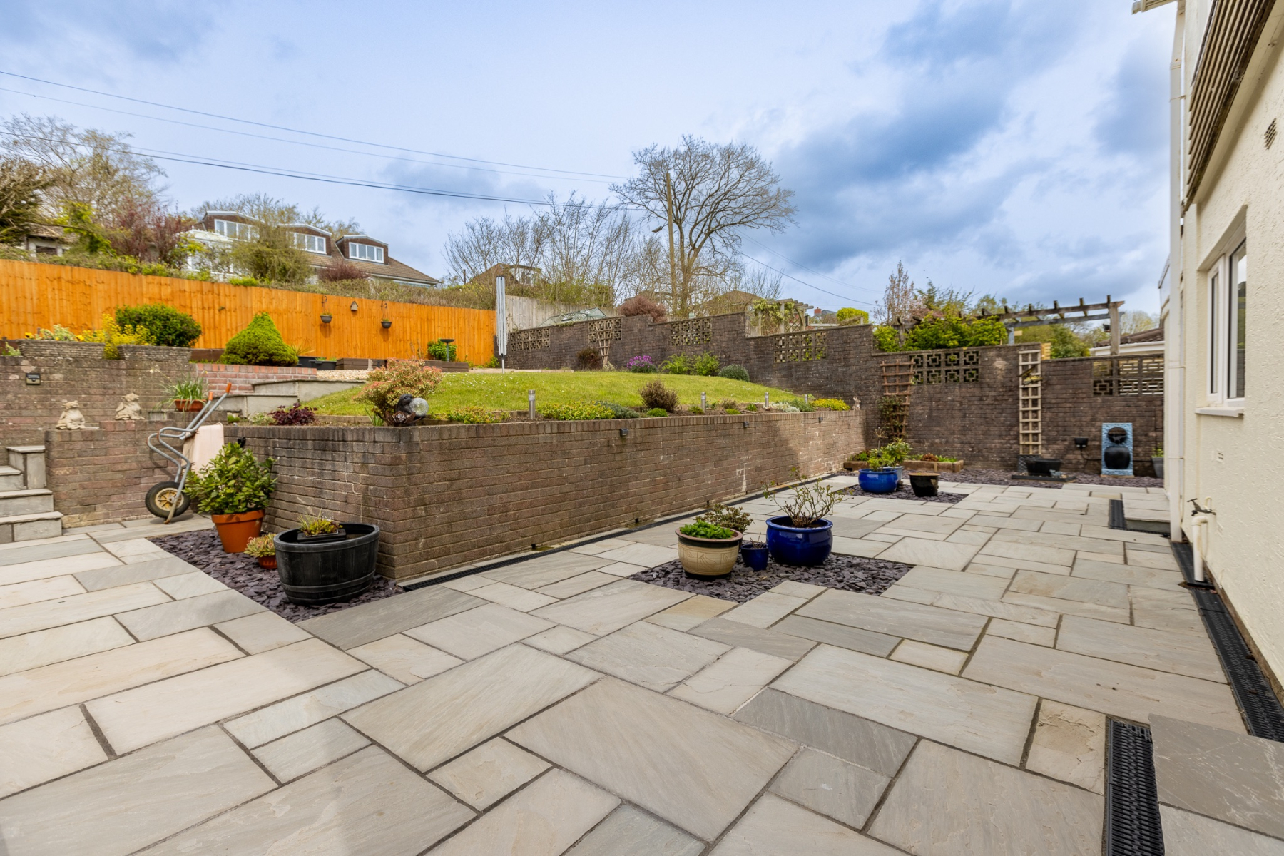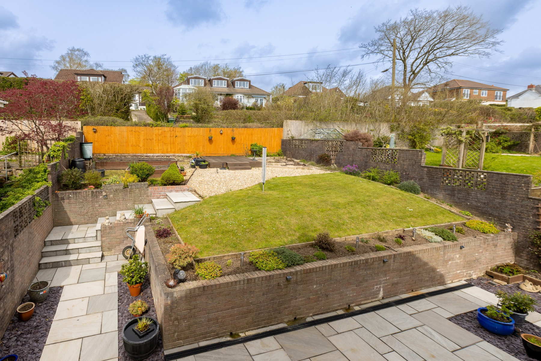 Patio to full width of the property with steps leading up to an elevated sun area surrounded by attractive wooden fencing. Easily maintained rockery area with a wide range of mature shrubs. Side access.