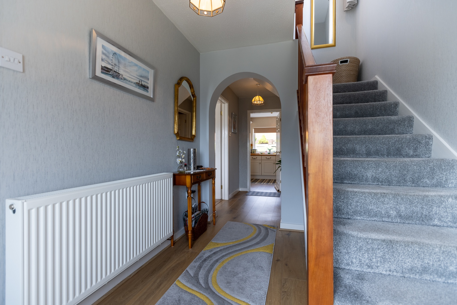 A spacious hallway with an attractive decorative archway and a splitlevel staircase rising to the first floor. Doors lead to the lounge, kitchen/breakfast room and cloakroom/WC. Builtin storage cupboard. With good quality attractive laminate flooring.