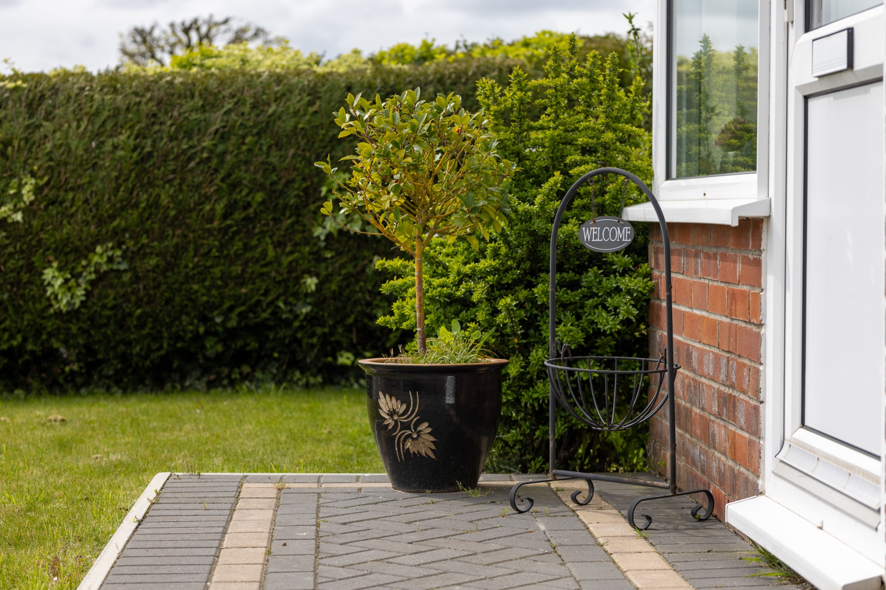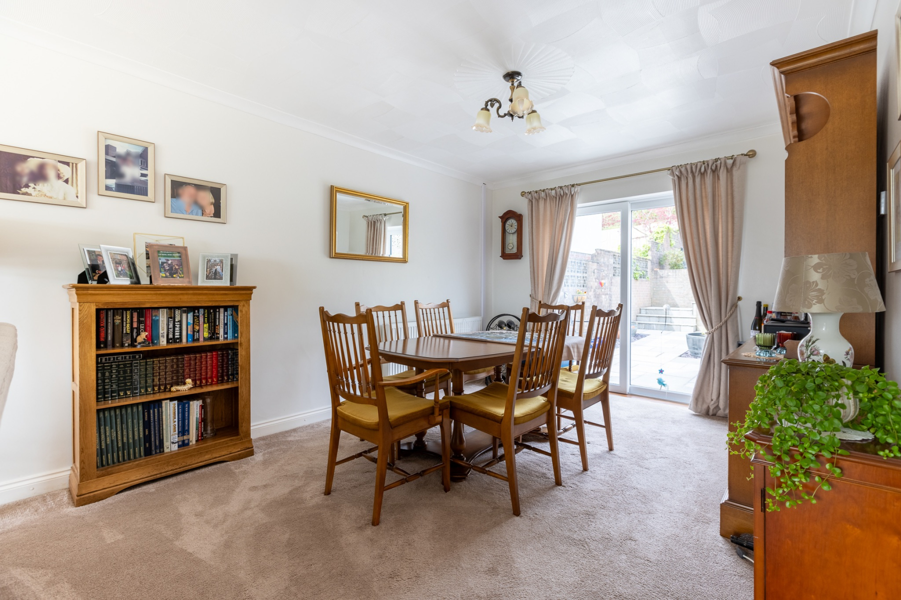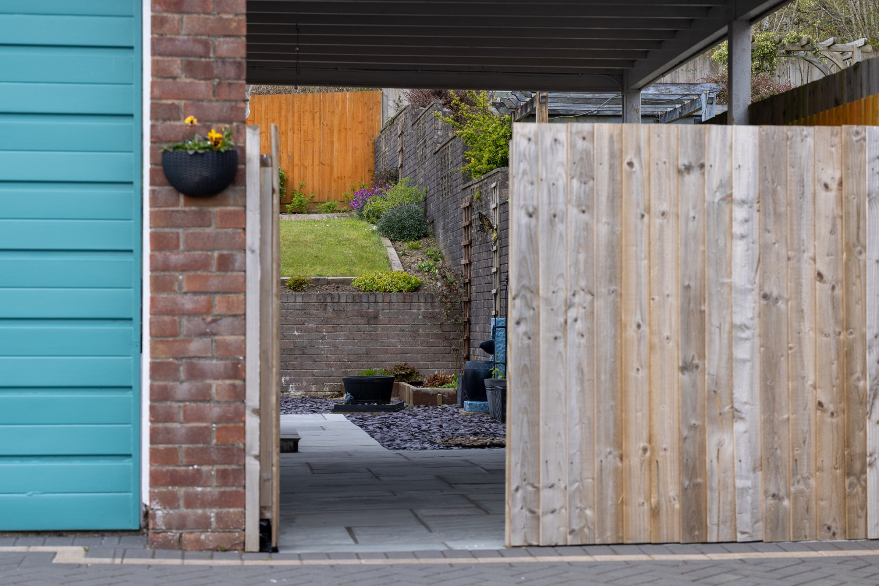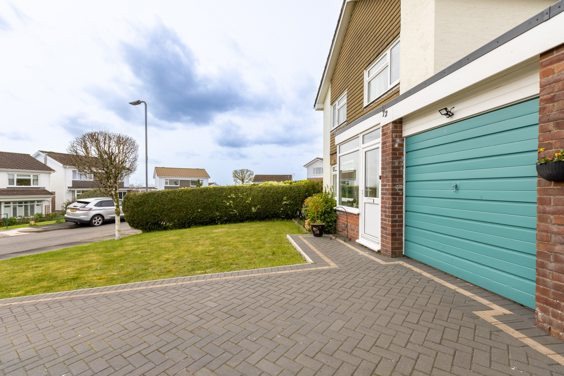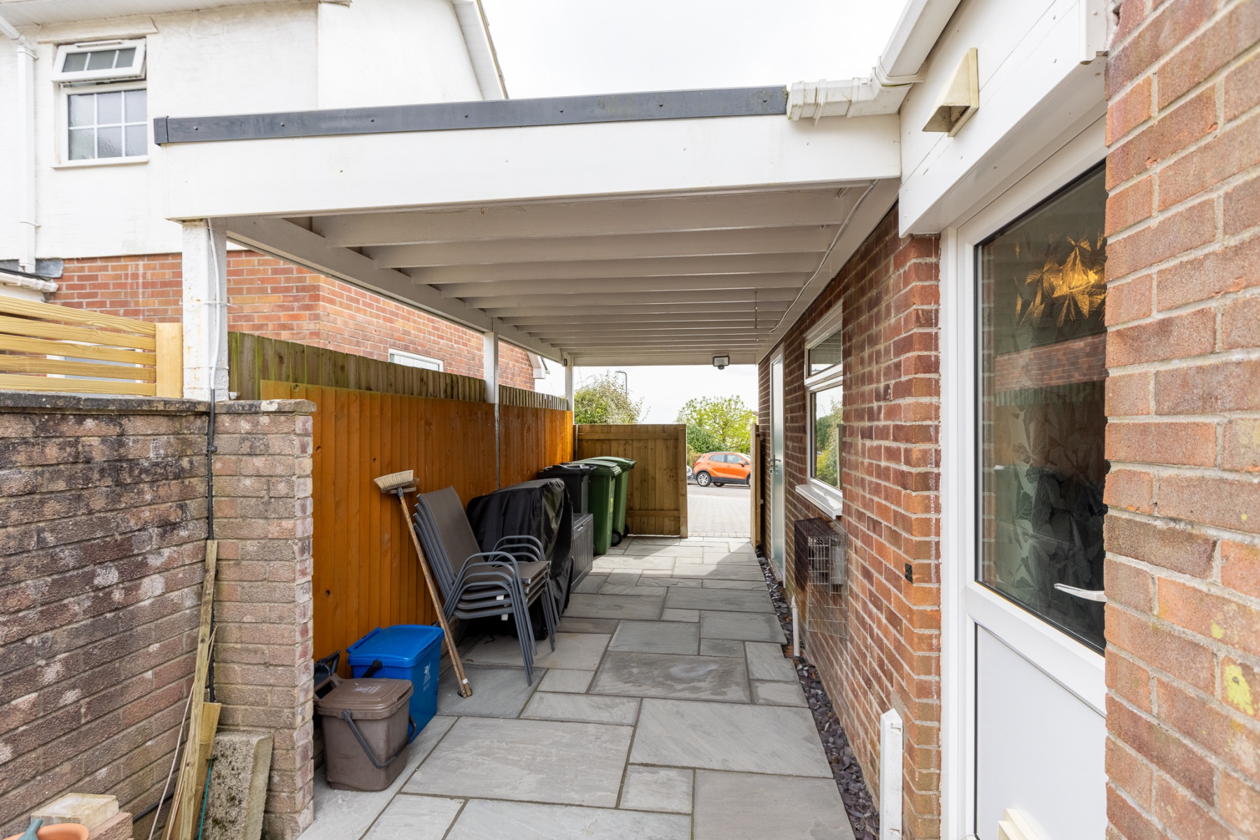 Good sized side space with block paving to one side plus access to the garage. Outside lighting.