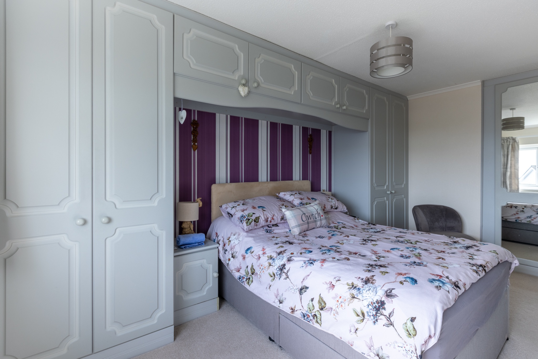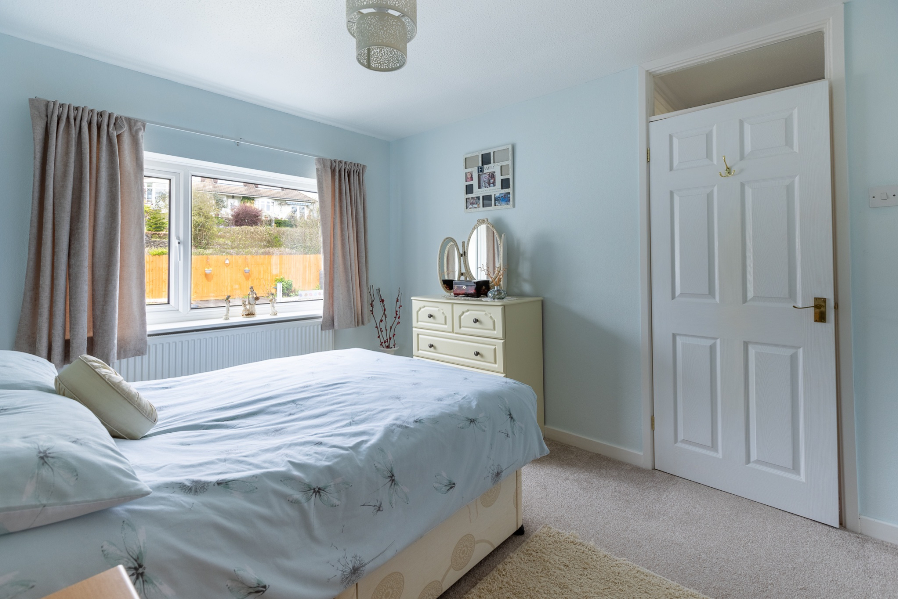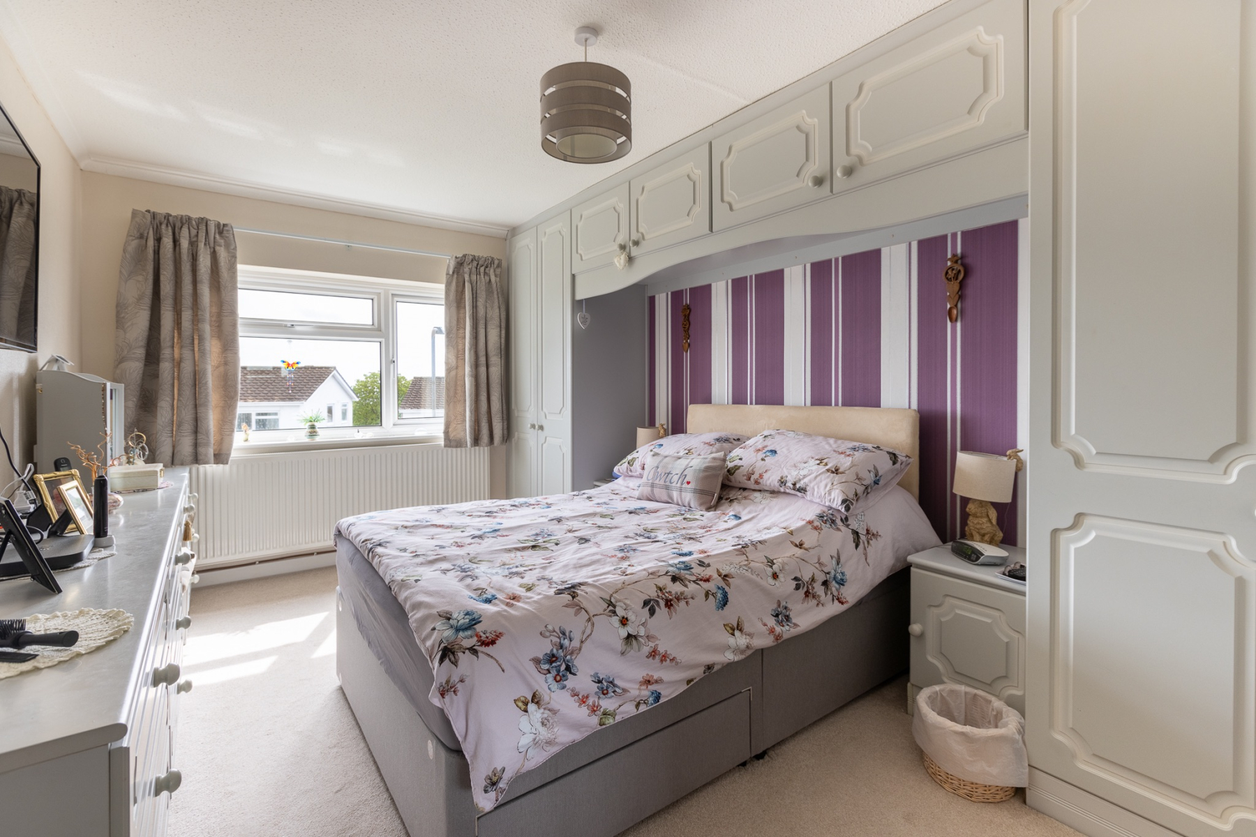 A beautifully appointed principal bedroom with an extensive range of fitted wardrobes, overhead storage, bedside units, chest of drawers and dressing table, completed with a built in wardrobe. uPVC doubleglazed window overlooking the front garden and some amazing views.