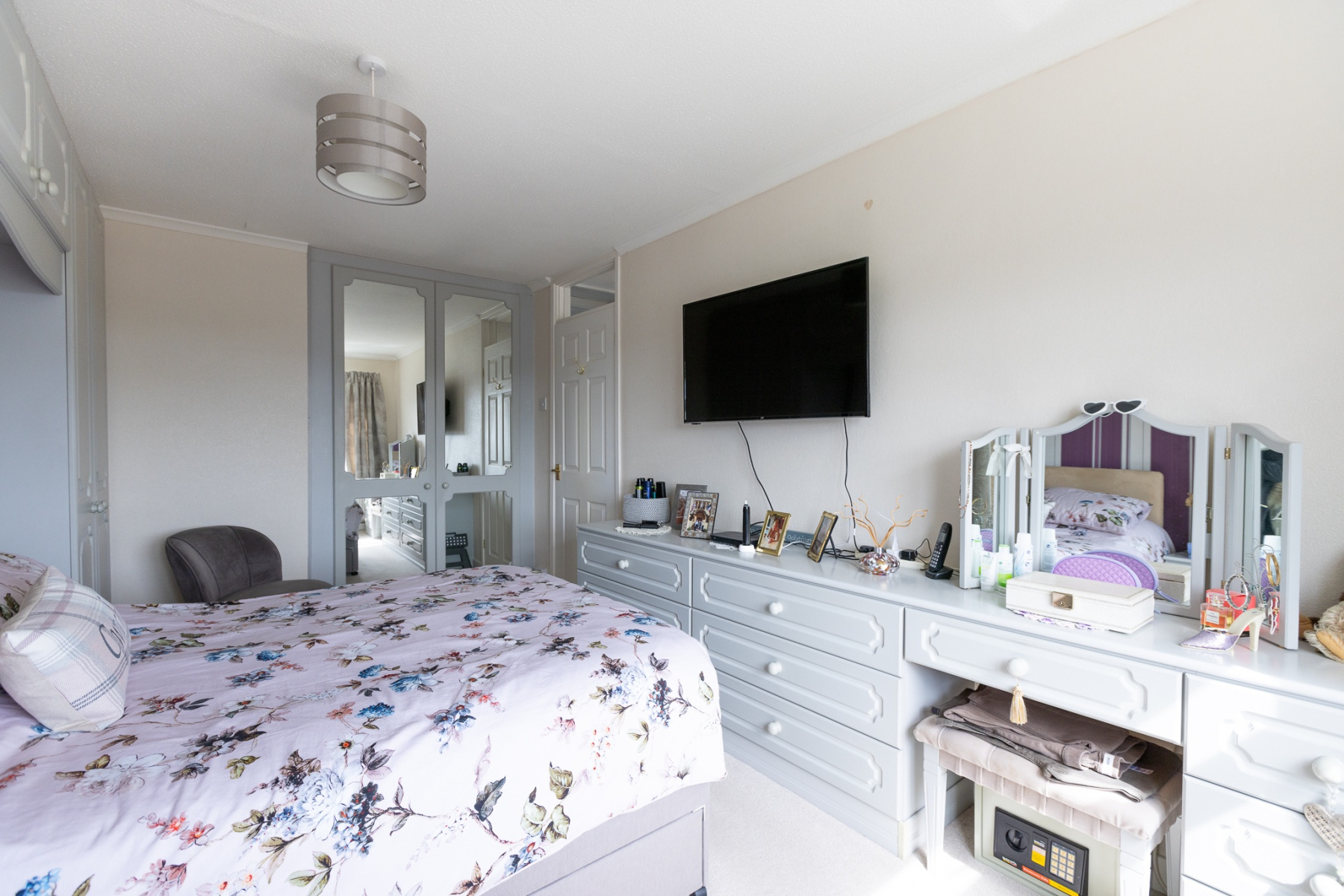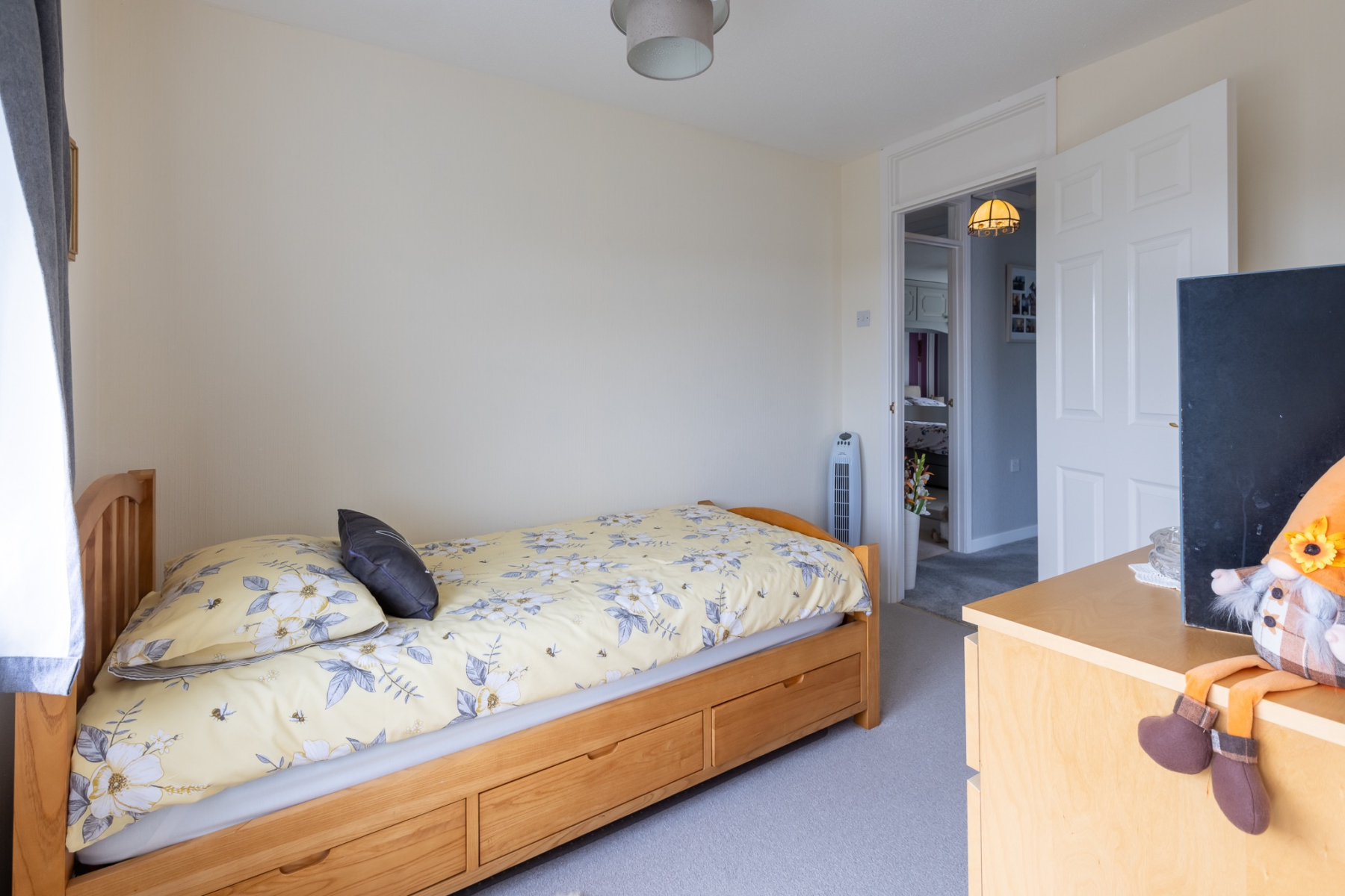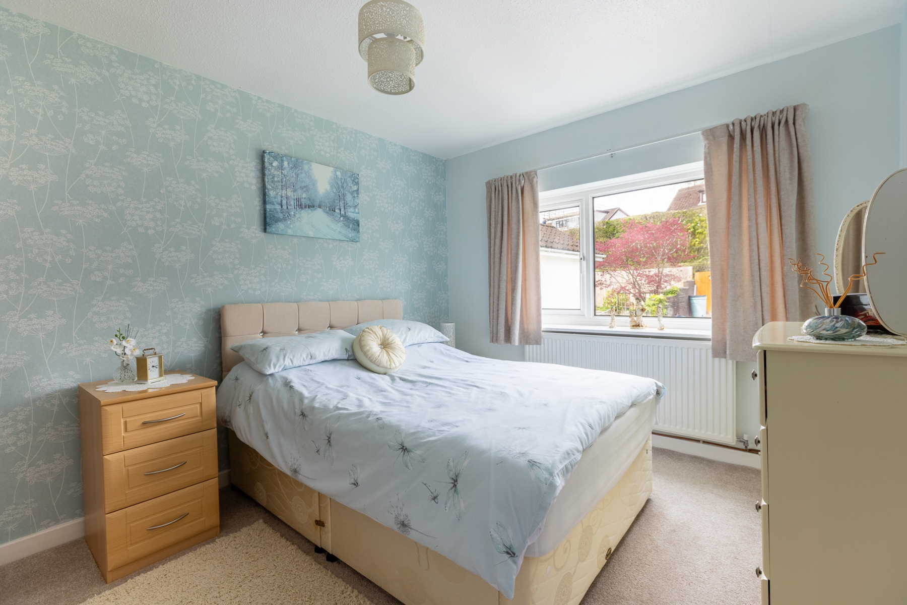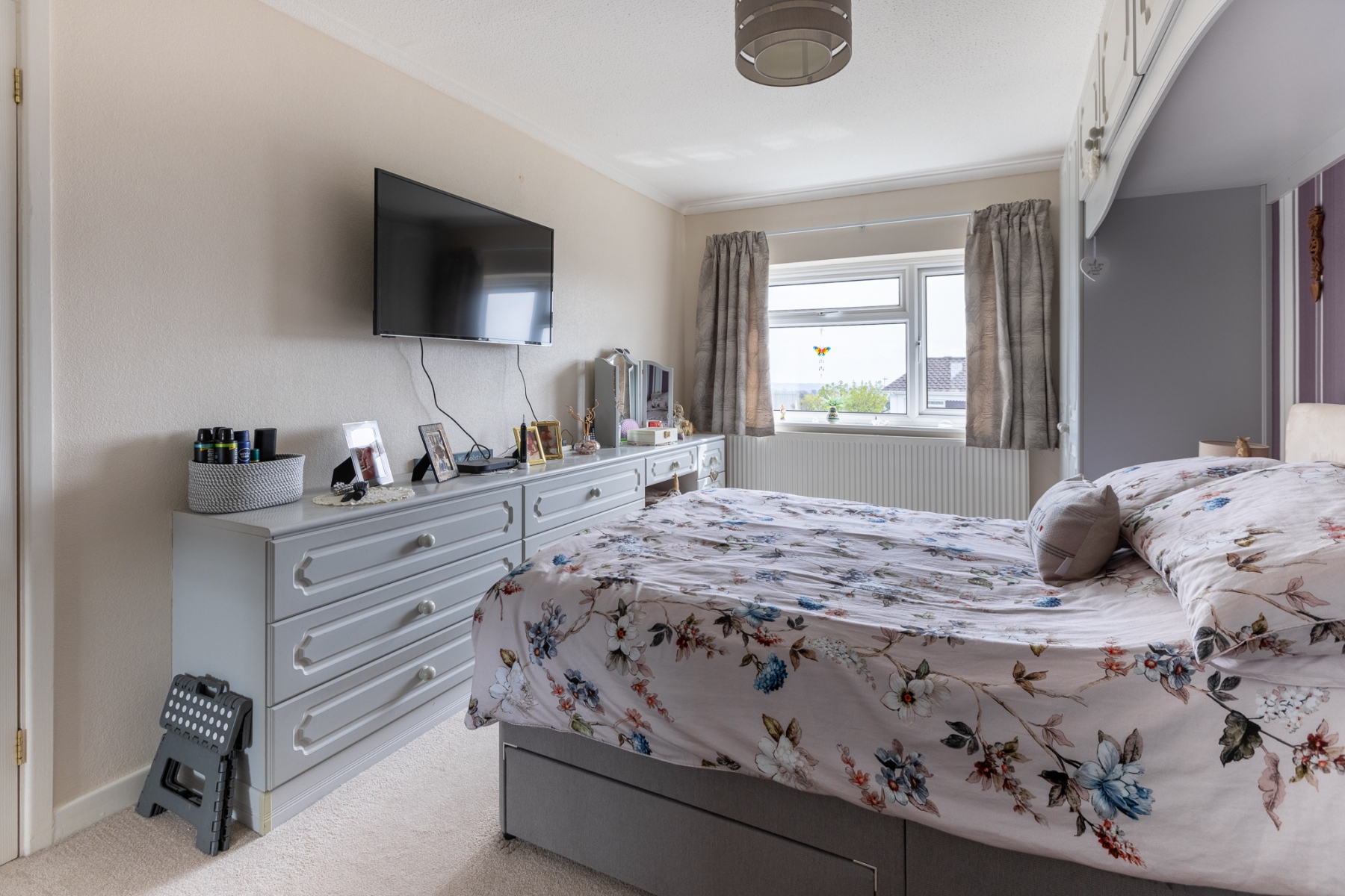 A beautifully appointed principal bedroom with an extensive range of fitted wardrobes, overhead storage, bedside units, chest of drawers and dressing table, completed with a built in wardrobe. uPVC doubleglazed window overlooking the front garden and some amazing views.