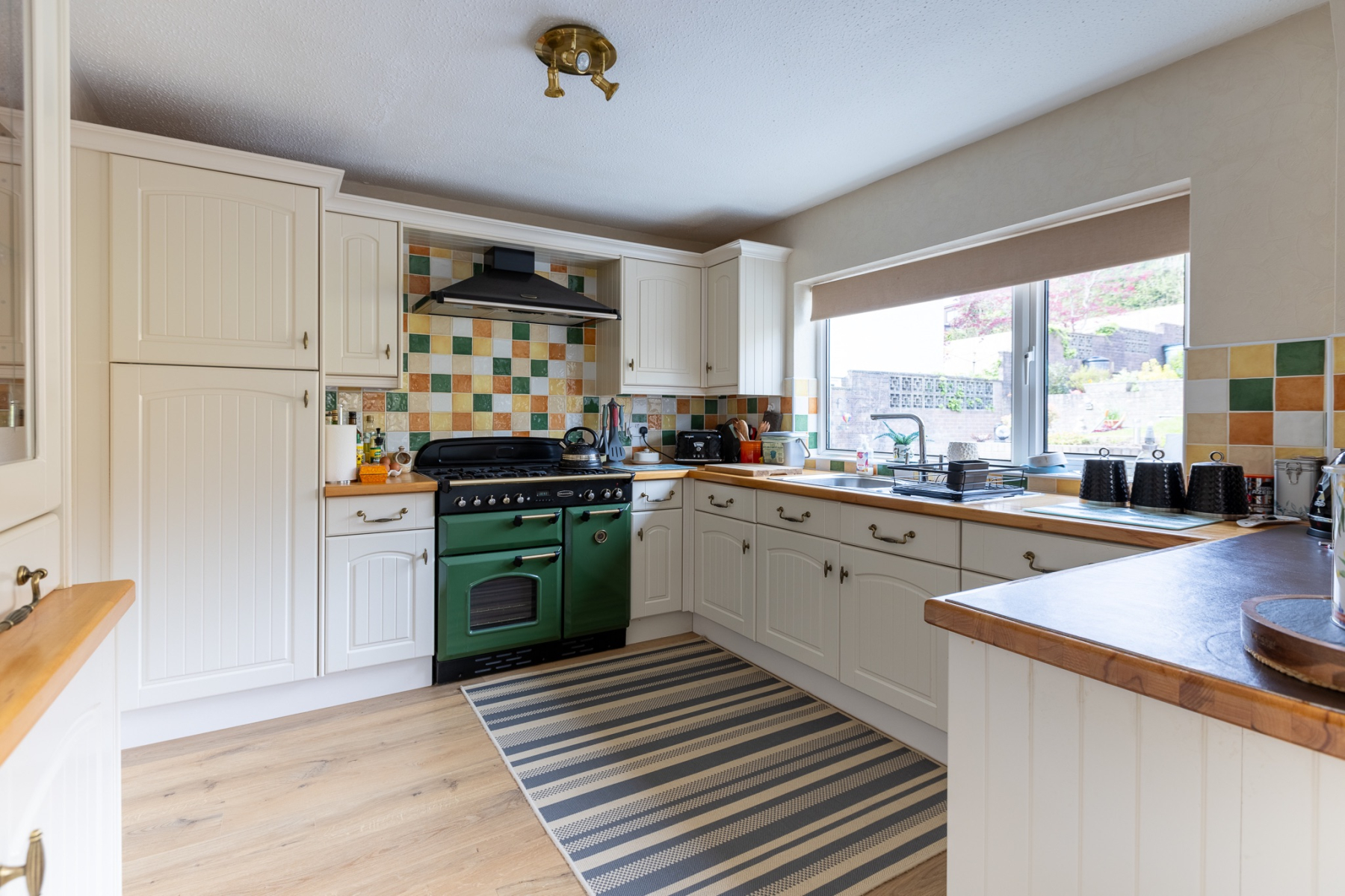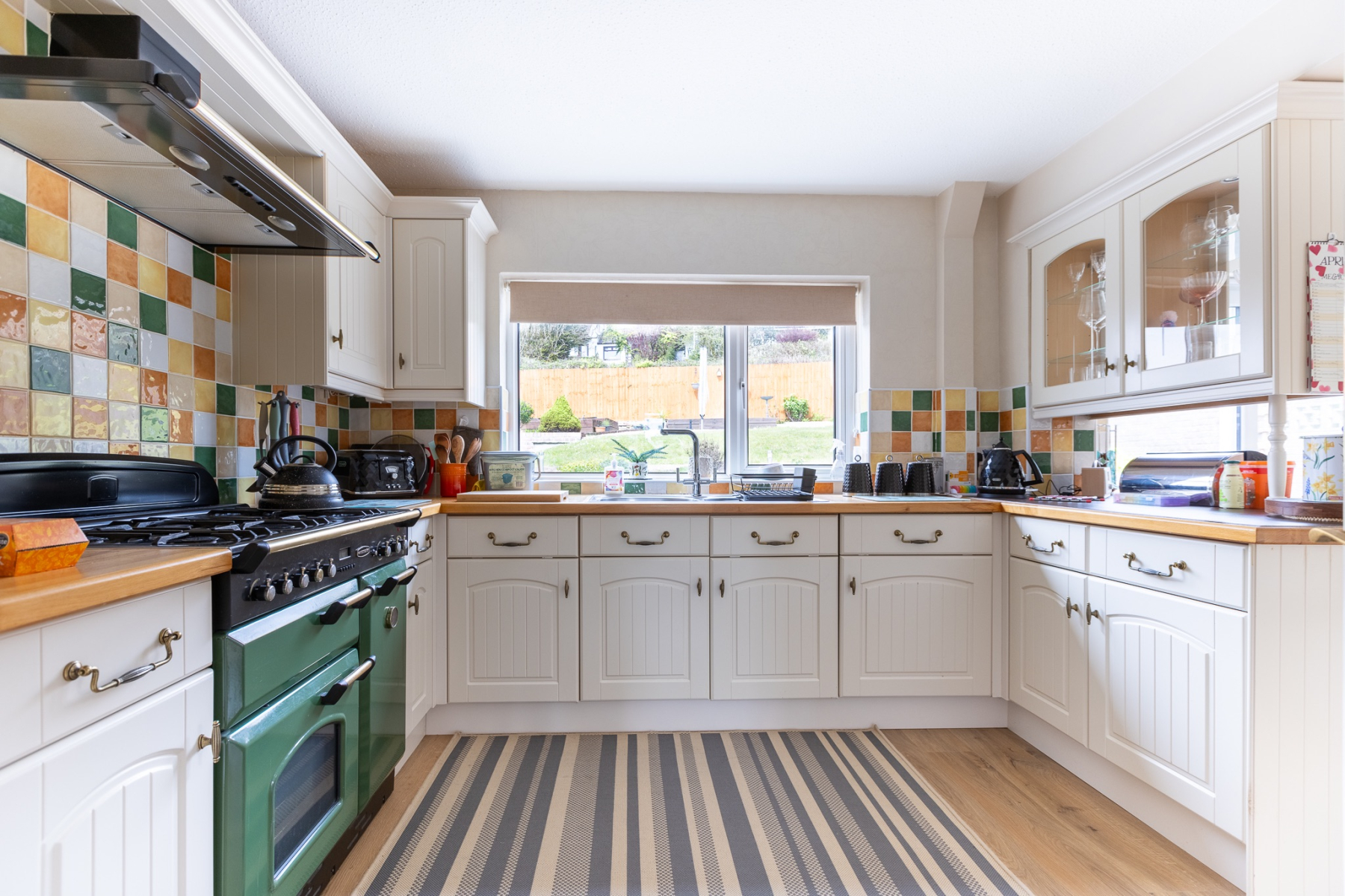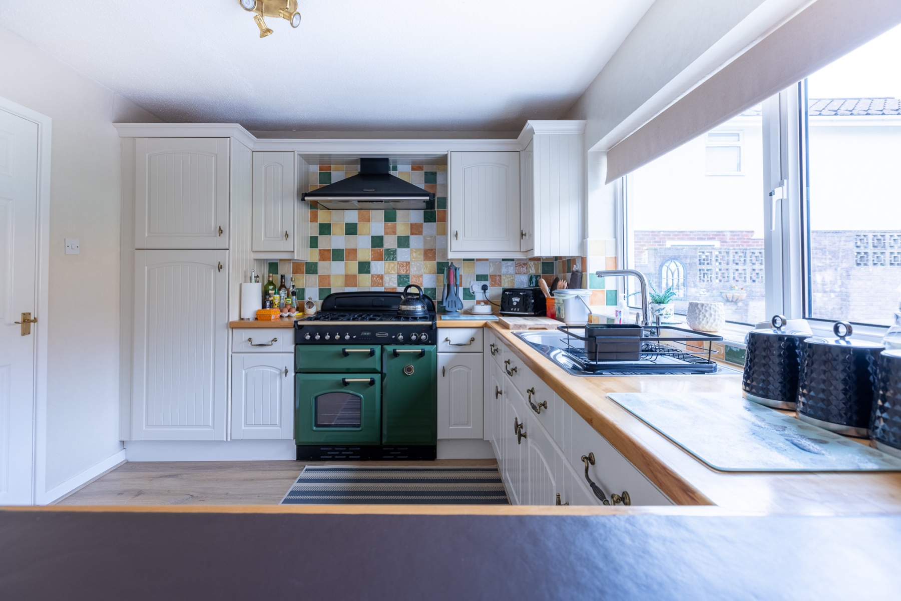 A generous family kitchen fitted with an extensive range of base and wall units, including a stainless steel sink and complementary work surfaces. The kitchen is a beautifully presented, welcoming space that blends charm, practicality, and familyfriendly design. Cream shakerstyle cabinetry is paired with solid wooden worktops, creating a warm and timeless aesthetic. A colourful tiled splashback adds personality and vibrancy, complementing the impressive green Rangemaster cooker that forms the centrepiece of the room.