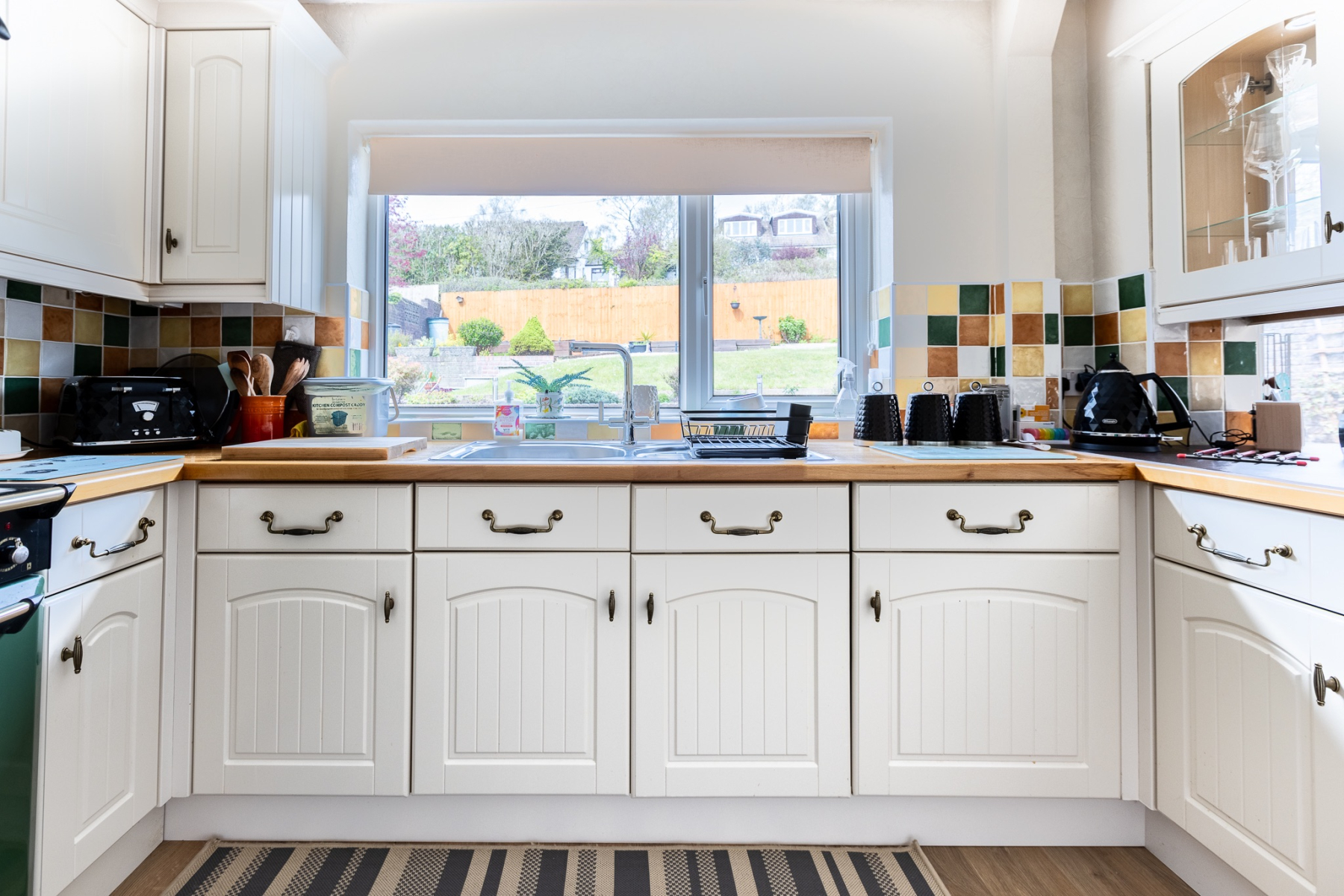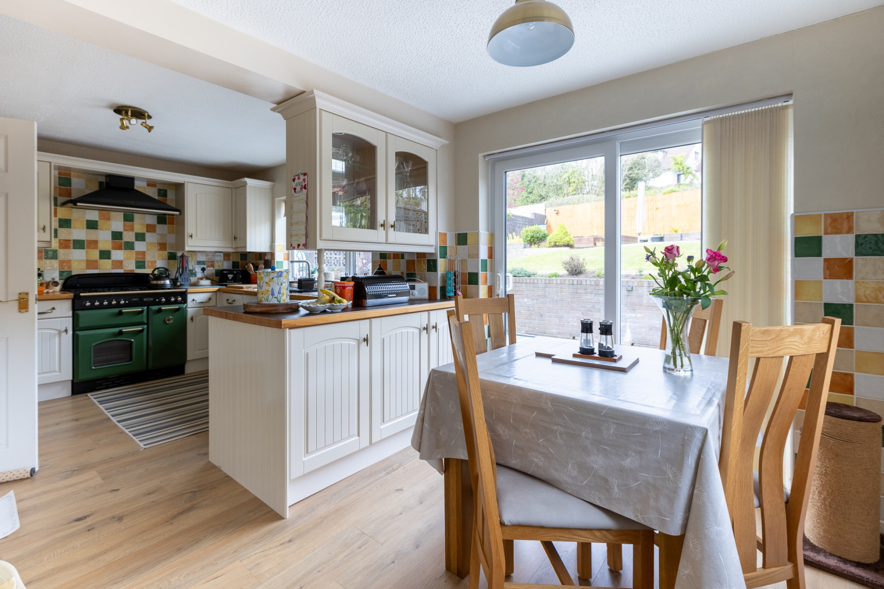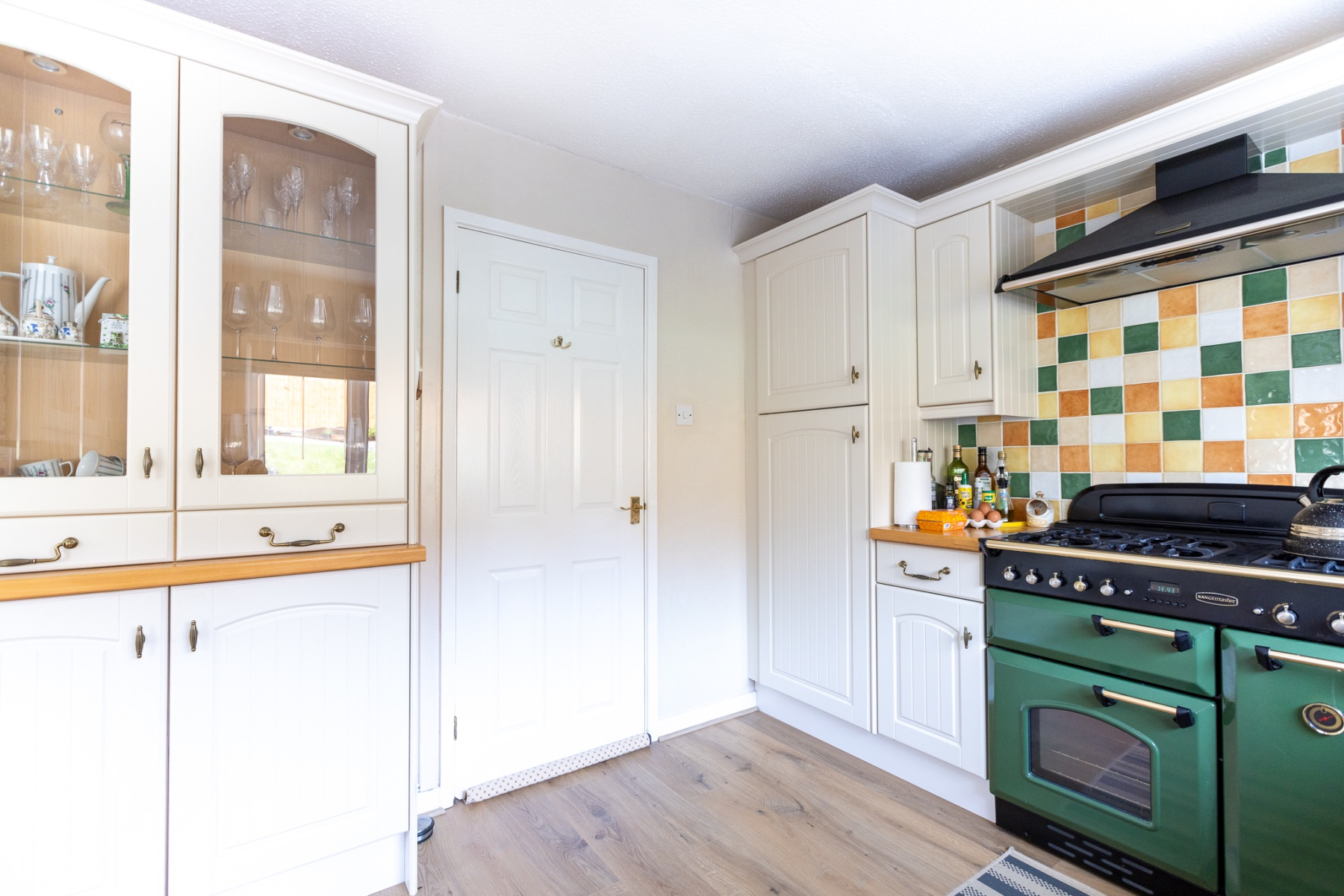 A generous family kitchen fitted with an extensive range of base and wall units, including a stainless steel sink and complementary work surfaces. The kitchen is a beautifully presented, welcoming space that blends charm, practicality, and familyfriendly design. Cream shakerstyle cabinetry is paired with solid wooden worktops, creating a warm and timeless aesthetic. A colourful tiled splashback adds personality and vibrancy, complementing the impressive green Rangemaster cooker that forms the centrepiece of the room.