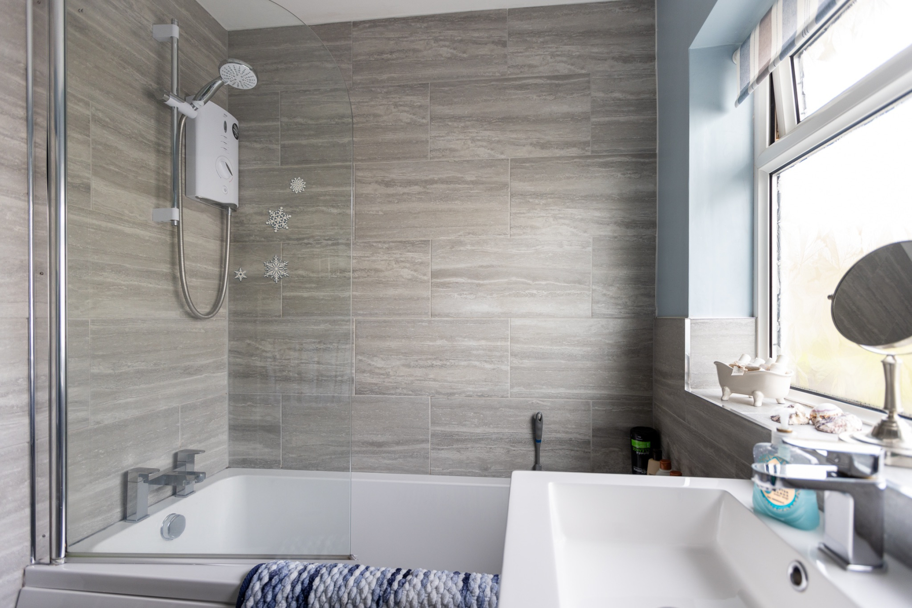 A bright recently refurbished family bathroom featuring a uPVC doubleglazed ceiling window, electric shower over a panelled bath with part tiled walls and shower screen. Vanity wash basin and vanityenclosed WC. Ladder radiator. Fully tiled white walls surrounding the bath and luxury vinyl flooring.