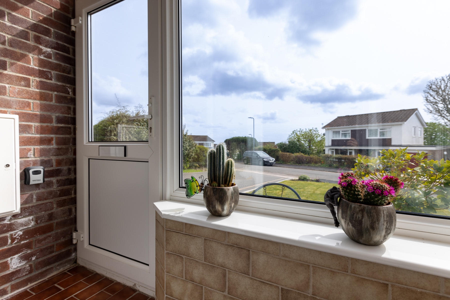 A welcoming enclosed porch featuring a dwarf wall and uPVC doubleglazed windows to two sides. Finished with ceramic tiled flooring and a door opening into the main reception hallway.