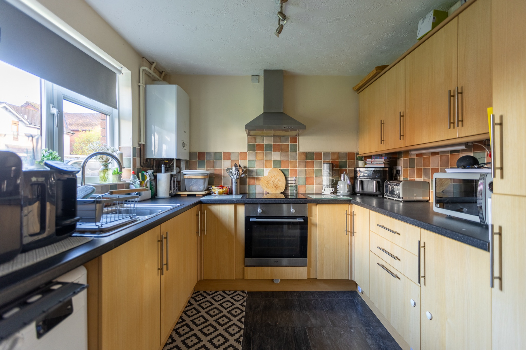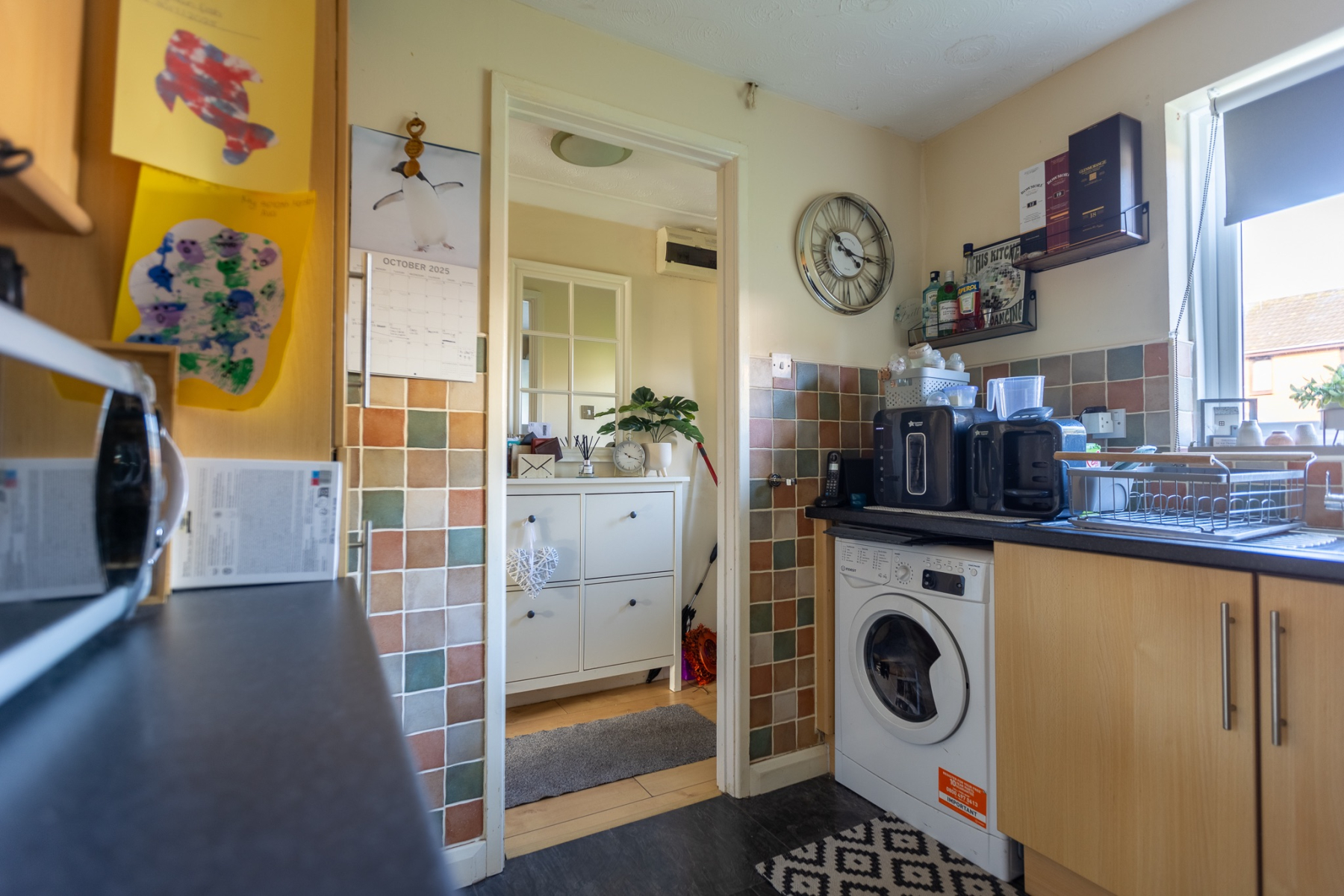 The home is approached via a paved pathway with a lawn frontage, and there is side access leading to the rear garden and garage. Stepping inside, the hallway provides access to the kitchen and lounge. The kitchen is fitted with a modern range of base and eyelevel units, complemented by a stainless steel sink, builtin oven, hob and extractor hood. Integrated appliances, including a fridge, freezer and washer/dryer, make this a practical and lowmaintenance space, ideal for busy firsttime buyers.