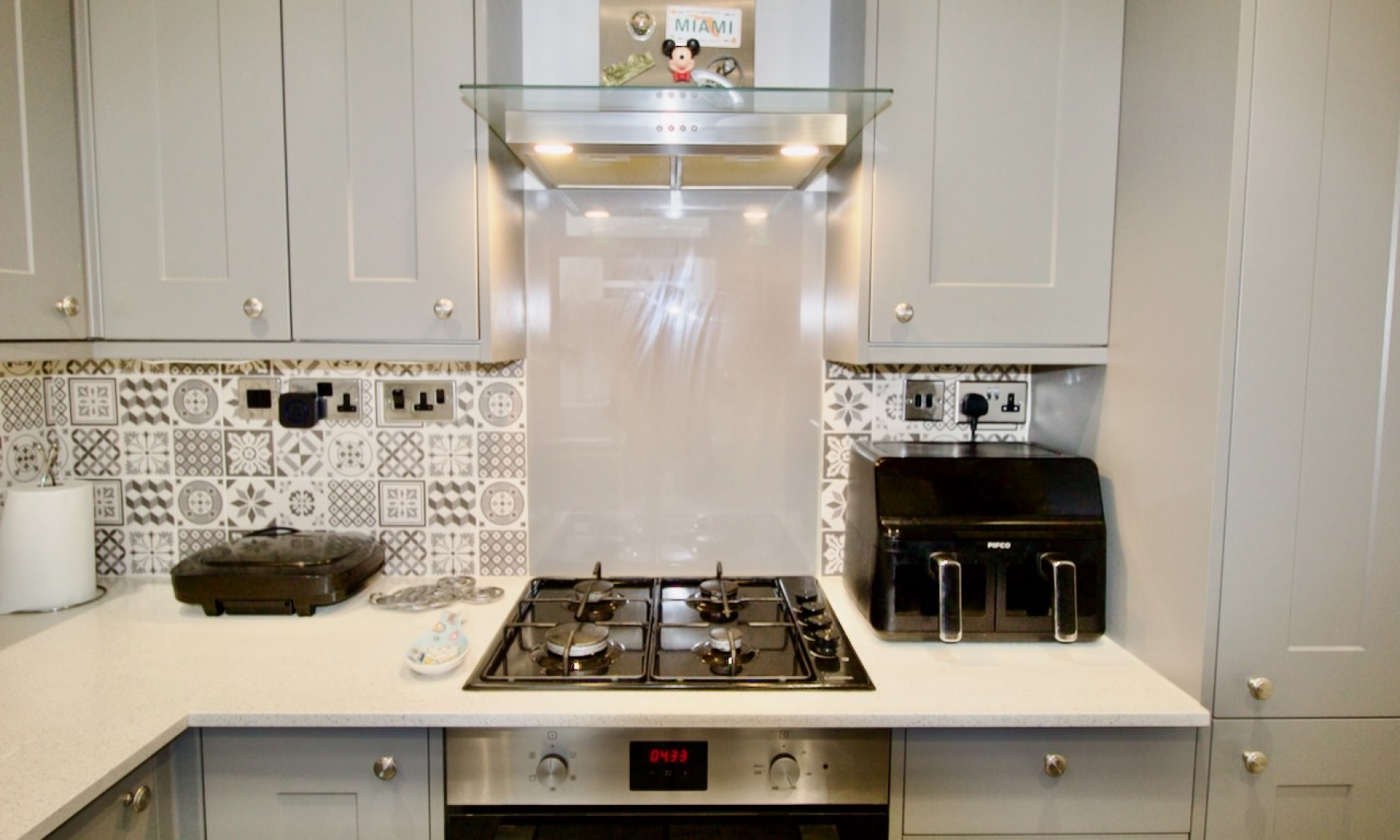 Kitchen. A stylish and modern kitchen with side-facing window, fitted with contemporary units at both eye and base level. Quality worktops and patterned splash back tiling frame the inset steel sink with mixer tap. Integrated electric oven/grill and four-ring hob with extractor hood above. Space for a fridge and freezer, tiled flooring, ample power points, and access to both the second reception room and utility room.