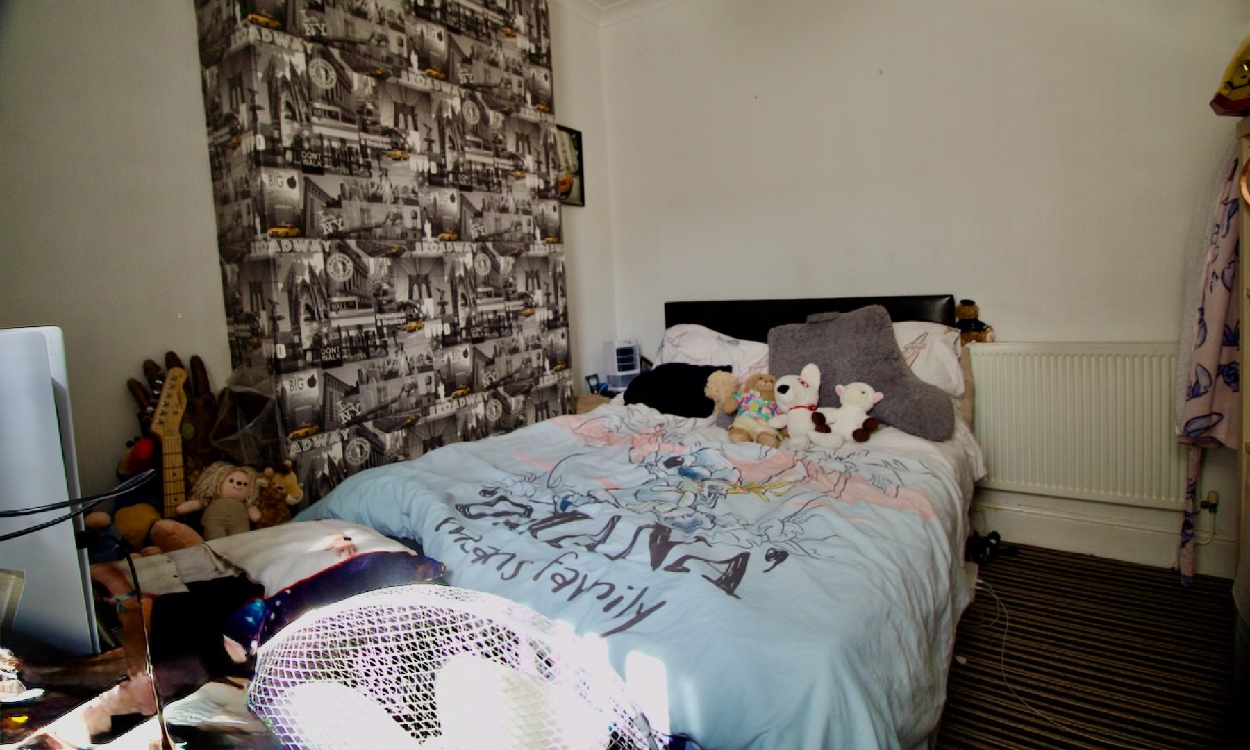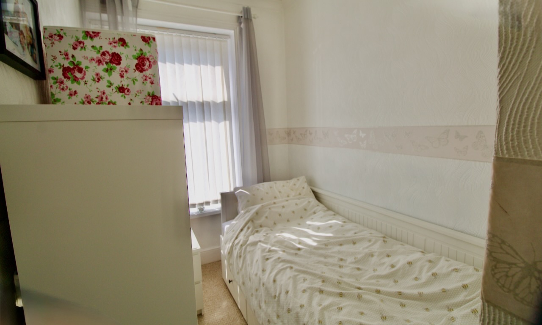 Bedroom 3. Currently used as a guest room for grandchildren, this front-facing bedroom suits a single bed and wardrobe. Could easily be repurposed as a home office or study.