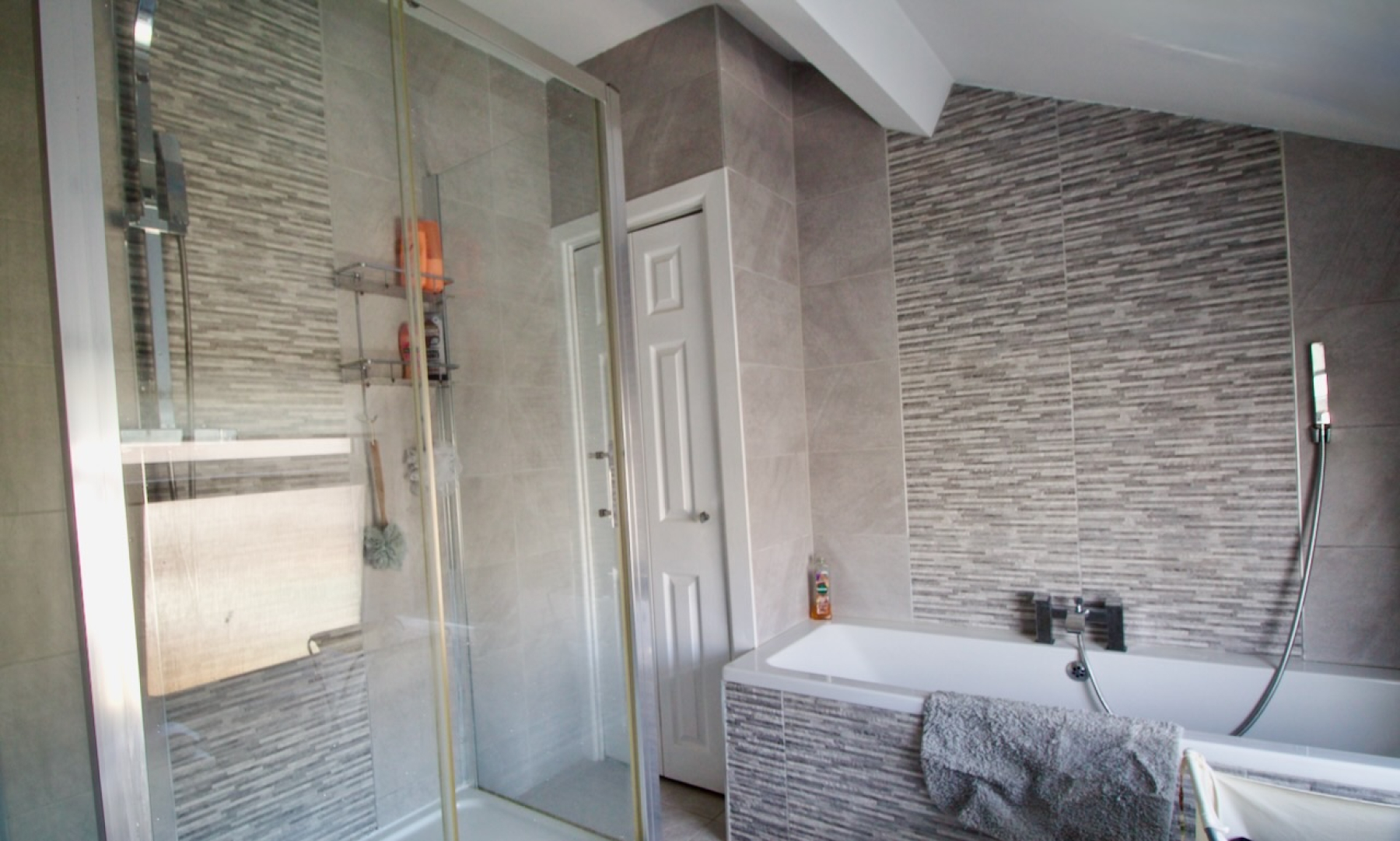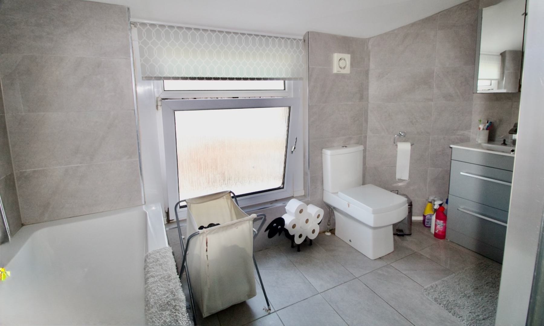 Bathroom. A spacious four piece family bathroom with opaque rear window, featuring a close-coupled WC, pedestal wash basin, and panelled bath with mixer tap and shower hose. A separate walk-in shower offers convenience for busy mornings. Includes fully tiled floor and walls, extractor fan, radiator and a storage cupboard housing the gas combination boiler.