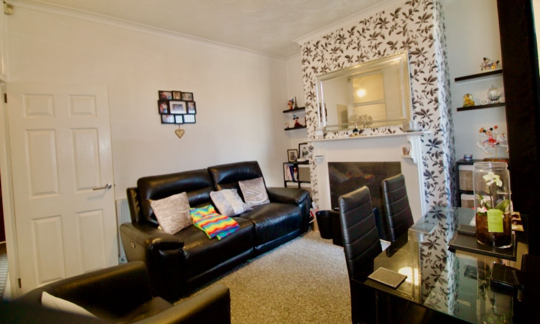 Living Room. Entered directly from the hallway, this bright and spacious living room features a uPVC double glazed window to the front, allowing natural light to pour in. There's ample room for two sofas, and a charming fireplace with wooden mantle offers scope for an electric fire or wood burner (note: current gas fire is non-operational). Includes radiator, TV and telephone points, and carpeted flooring.