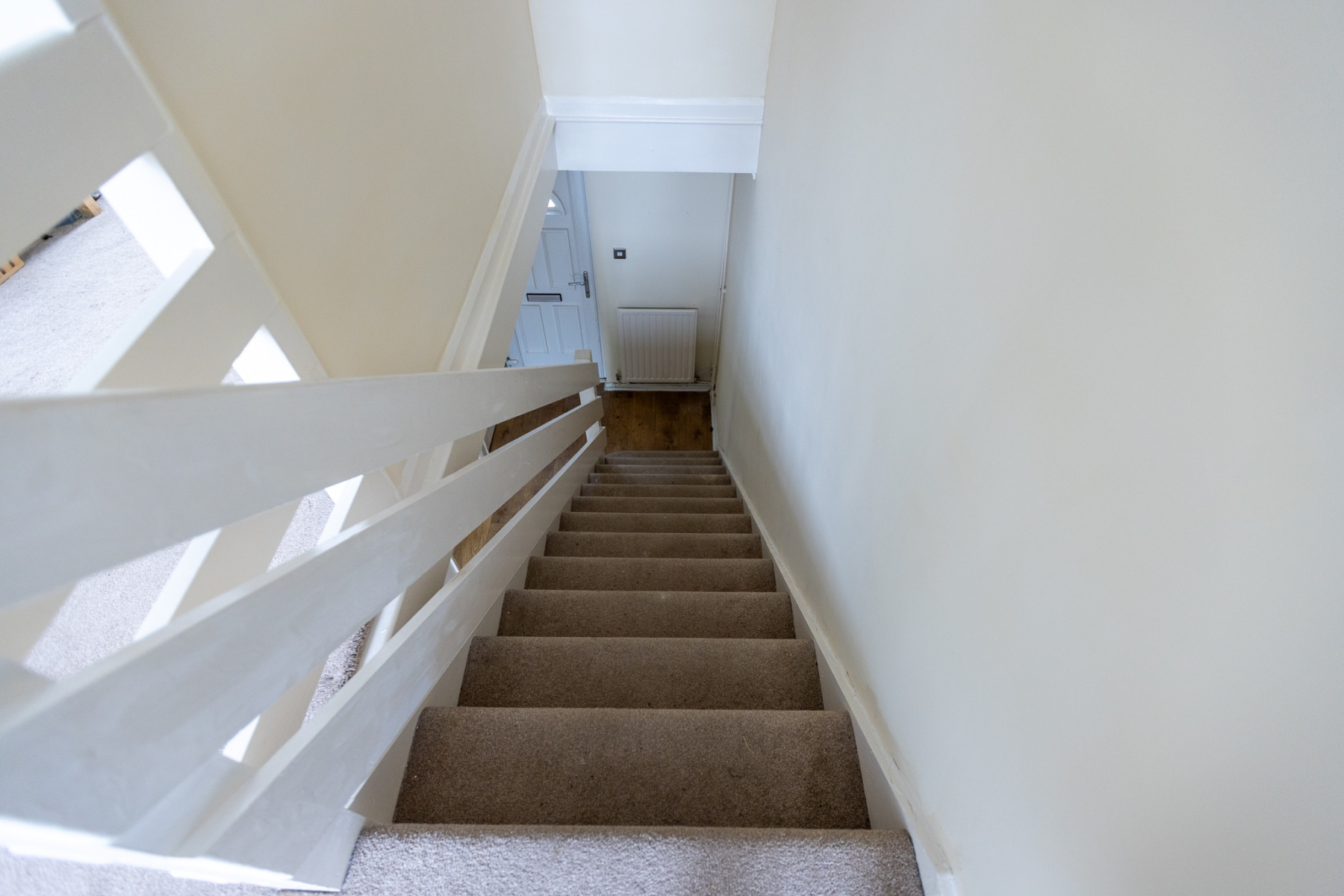 A white UPVC front door opens into a welcoming hallway with stairs leading to the first floor. Two generous storage cupboards provide practical space for coats, shoes and household essentials.