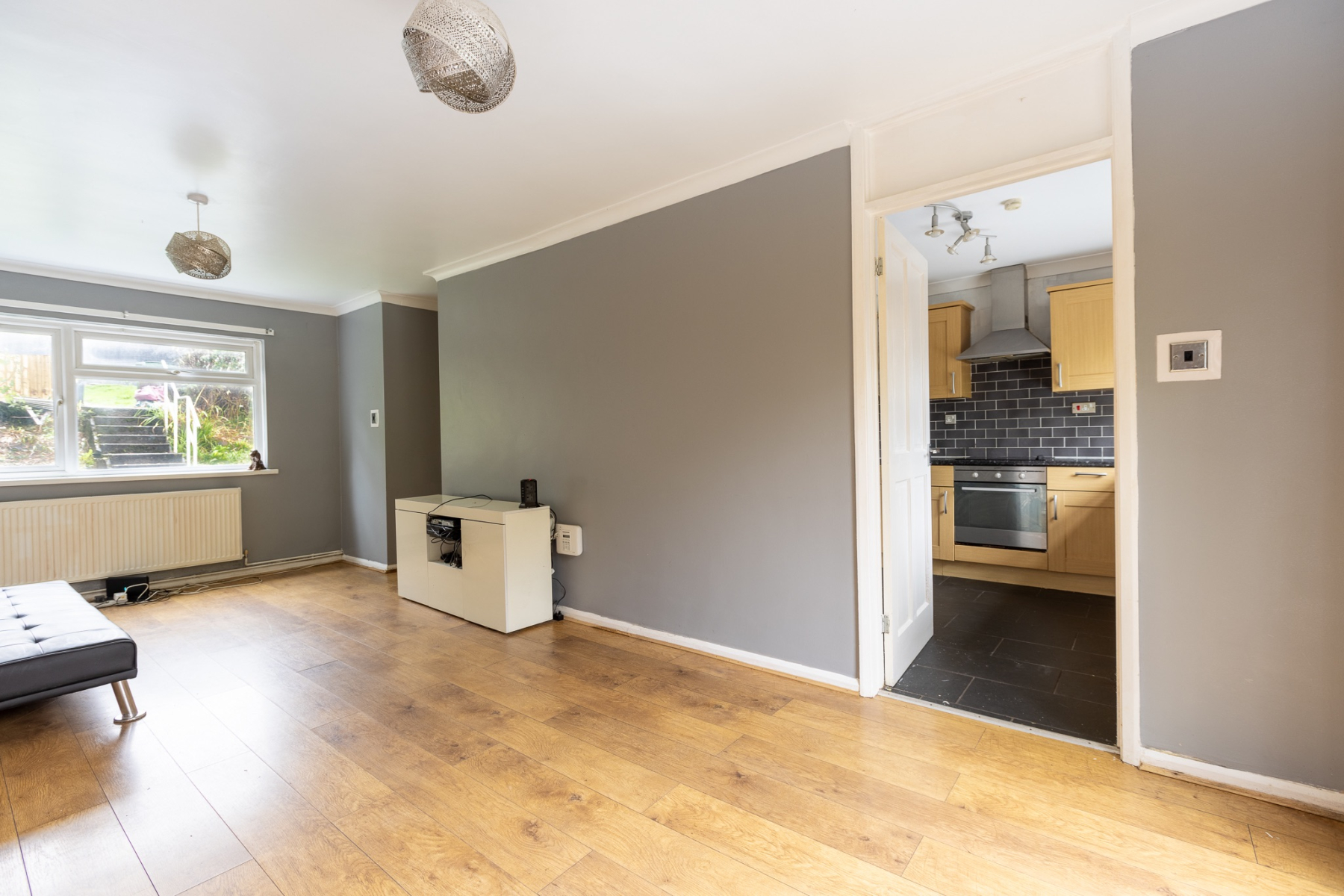 The kitchen boasts sleek beech wall and base units offering ample storage. A stainless steel sink with mixer tap sits beneath a large window overlooking the rear garden, flooding the space with natural light. Equipped with a four-ring electric hob (extractor over), electric oven and space for a tumble dryer, washing machine, and fridge freezer (appliances not included).
